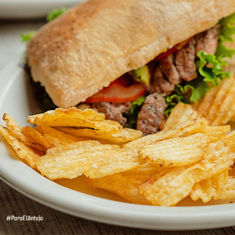 Pan artesanal tipo chapata, con queso oaxaca, jamón, queso manchego, jitomate, lechuga, cebolla, mayonesa y 120 g de arrachera