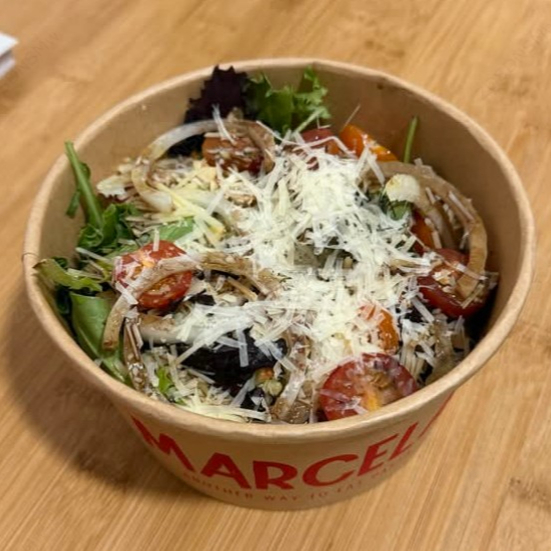 Mezcla de lechugas, jitomates cherry, queso parmesano, almendras, cebolla, aceite de oliva y un toque de vinagre balsámico.