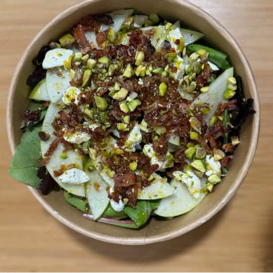 Mezcla de lechugas, pistaches, pera, queso crema, ralladura de limón, aceite de oliva y tocino crujiente.