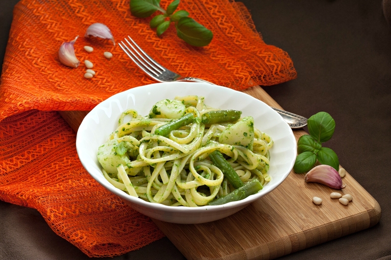Pasta larga al pesto siciliano con pomodoro, ajo, albahaca y espolvoreado con almendra tostada, pecorino y parmesano al gusto. 310 gramos.