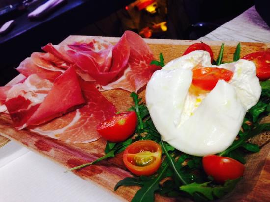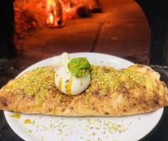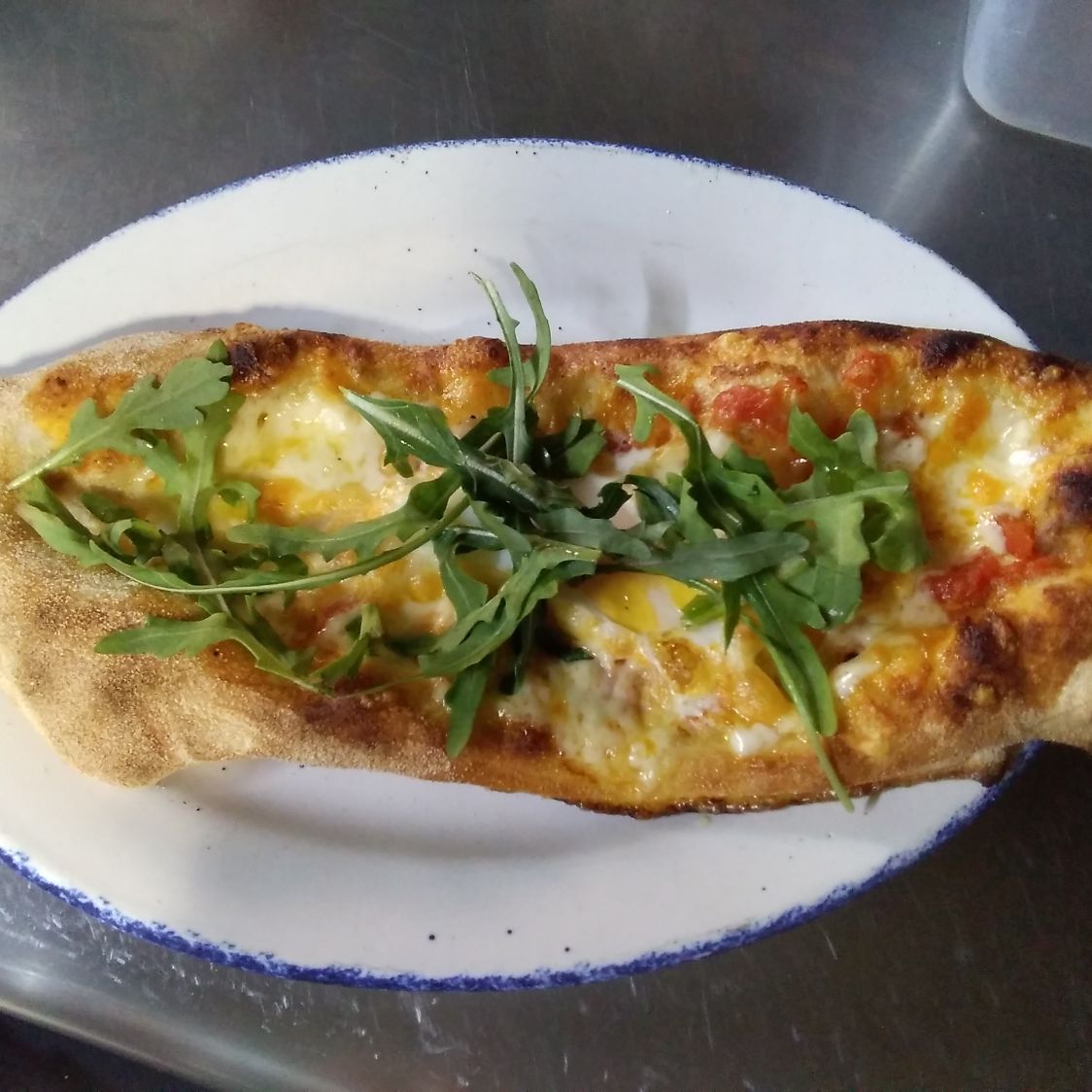 Pan de pizza con huevo horneado, queso mozzarella y salsa pomodoro arrabiata, ocinado en horno de leña. \200 grs.