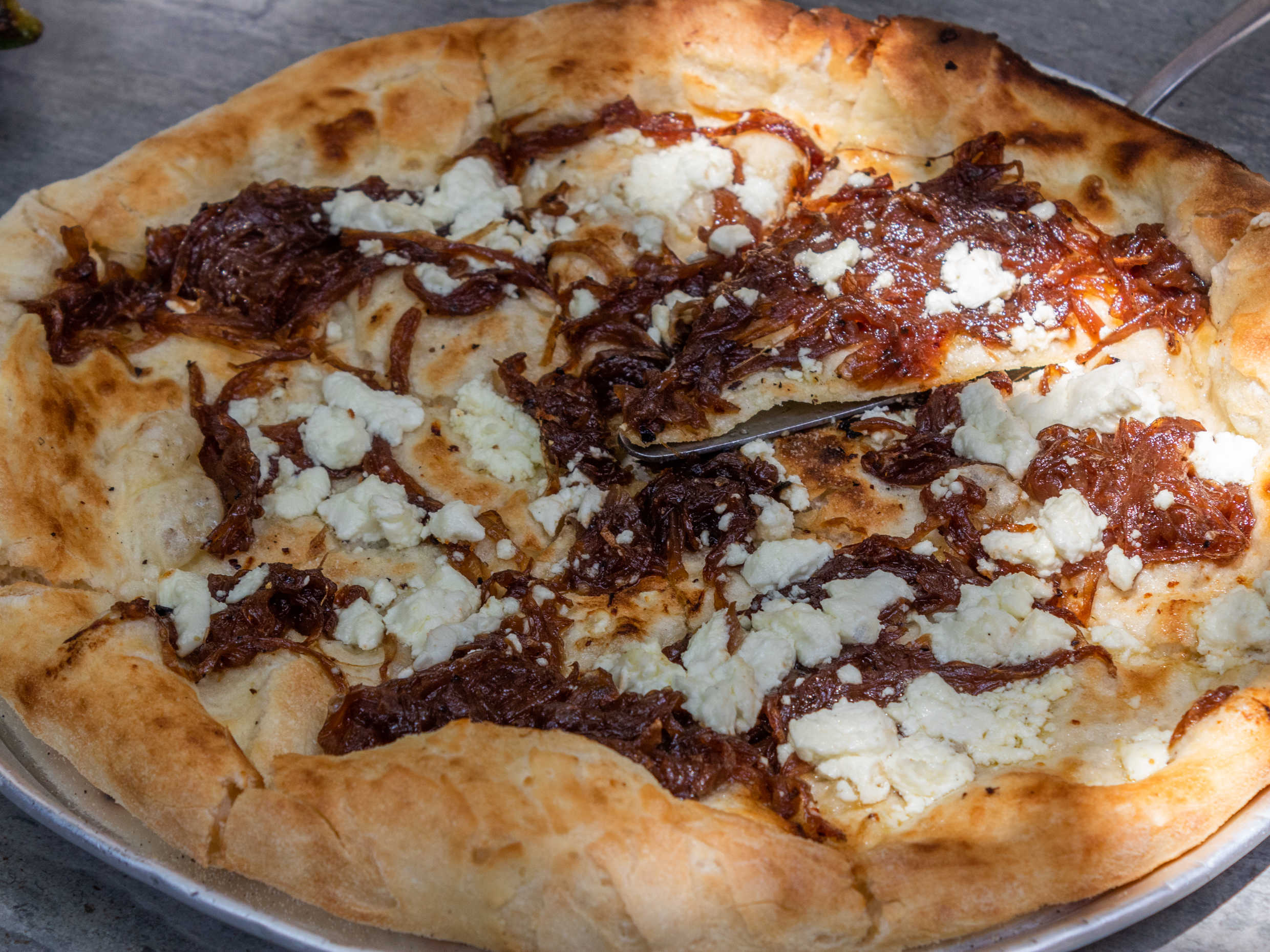 Pizza blanca con queso de cabra fresco, peras al Vino Tinto, acompañadas de una reducción de Vino y menta. 8 porciones. 440 grs.