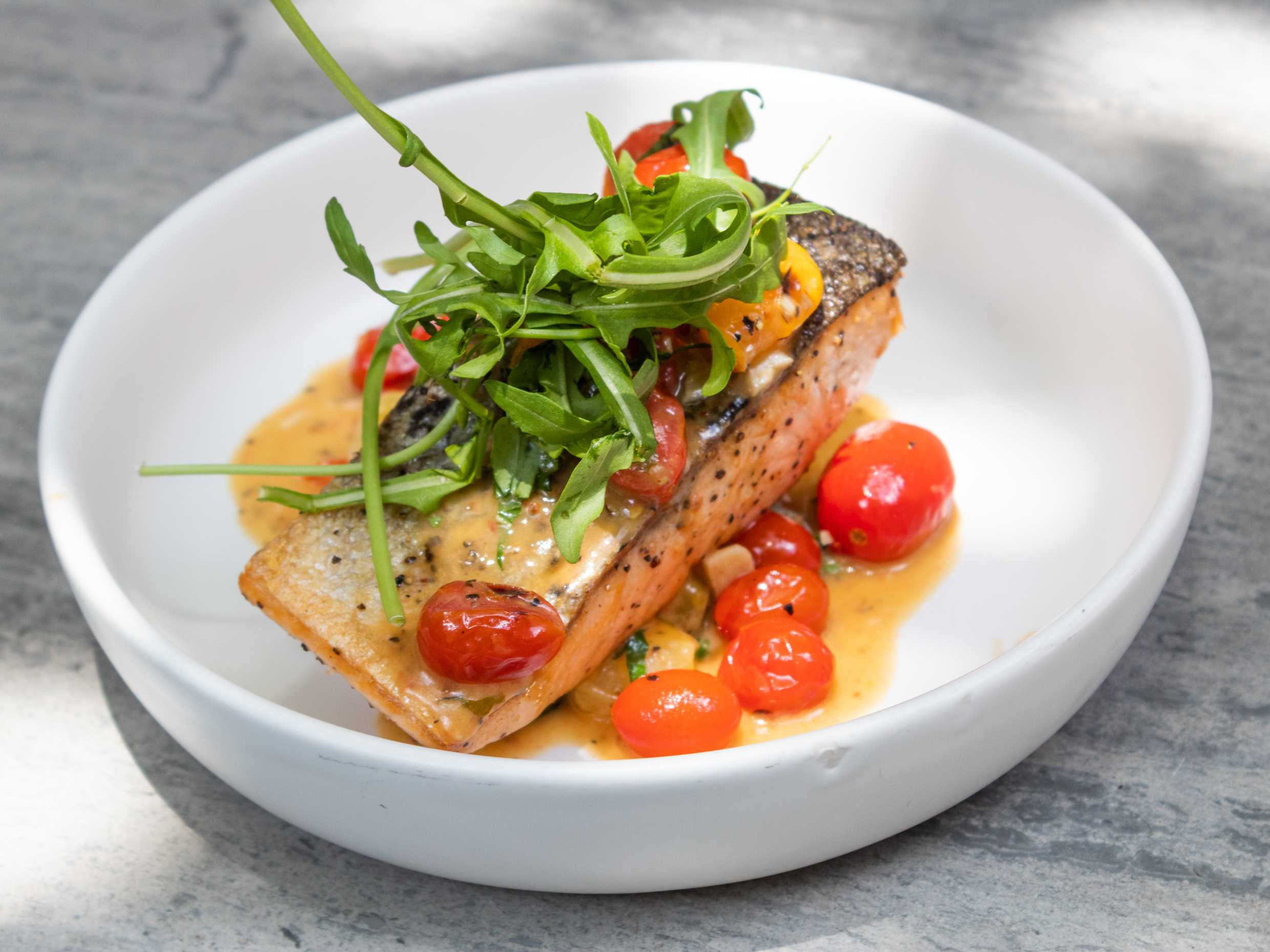 Sellado a la plancha acompañado de jitomate cherry caramelizado y arúgula. 220 grs