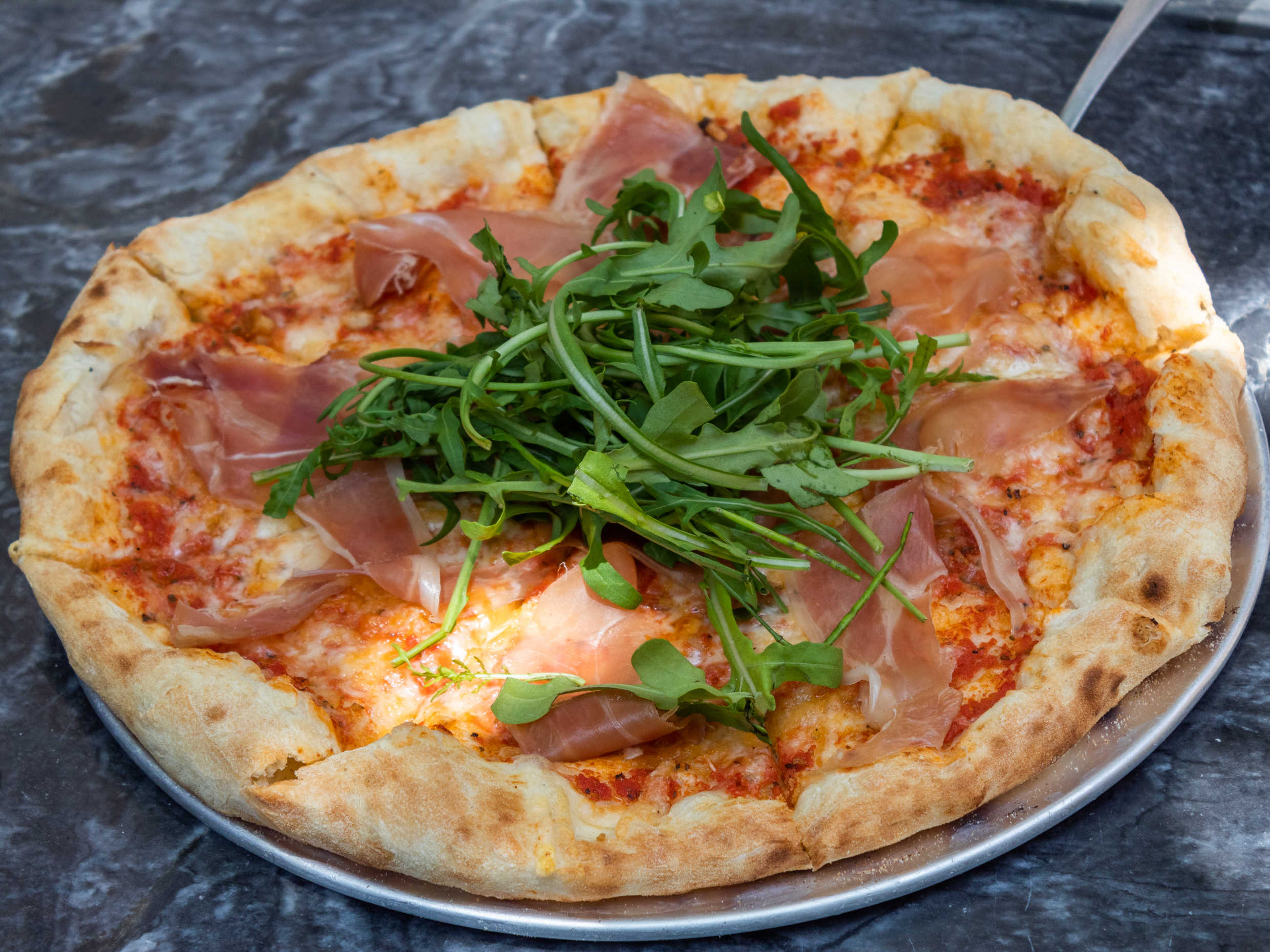 Pizza a base de pomodoro, mozzarella, prosciutto importado y trozos de arugula. 8 porciones de 490 gramos.
