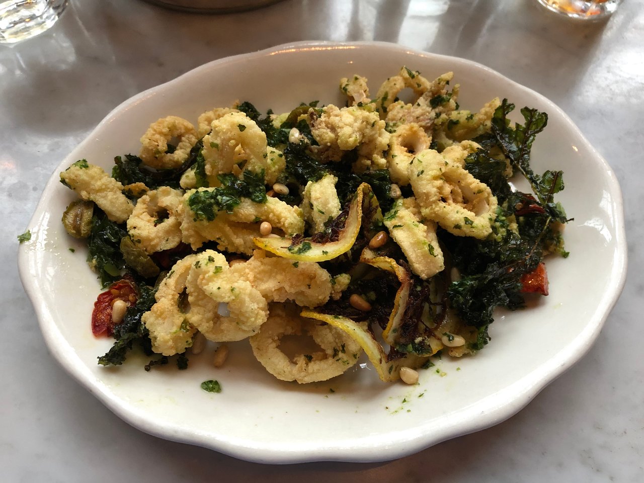 Aros de chipirón frito marinado en ajo, acompañados con aceite de peperoncino y limón amarillo. 150 gramos.
