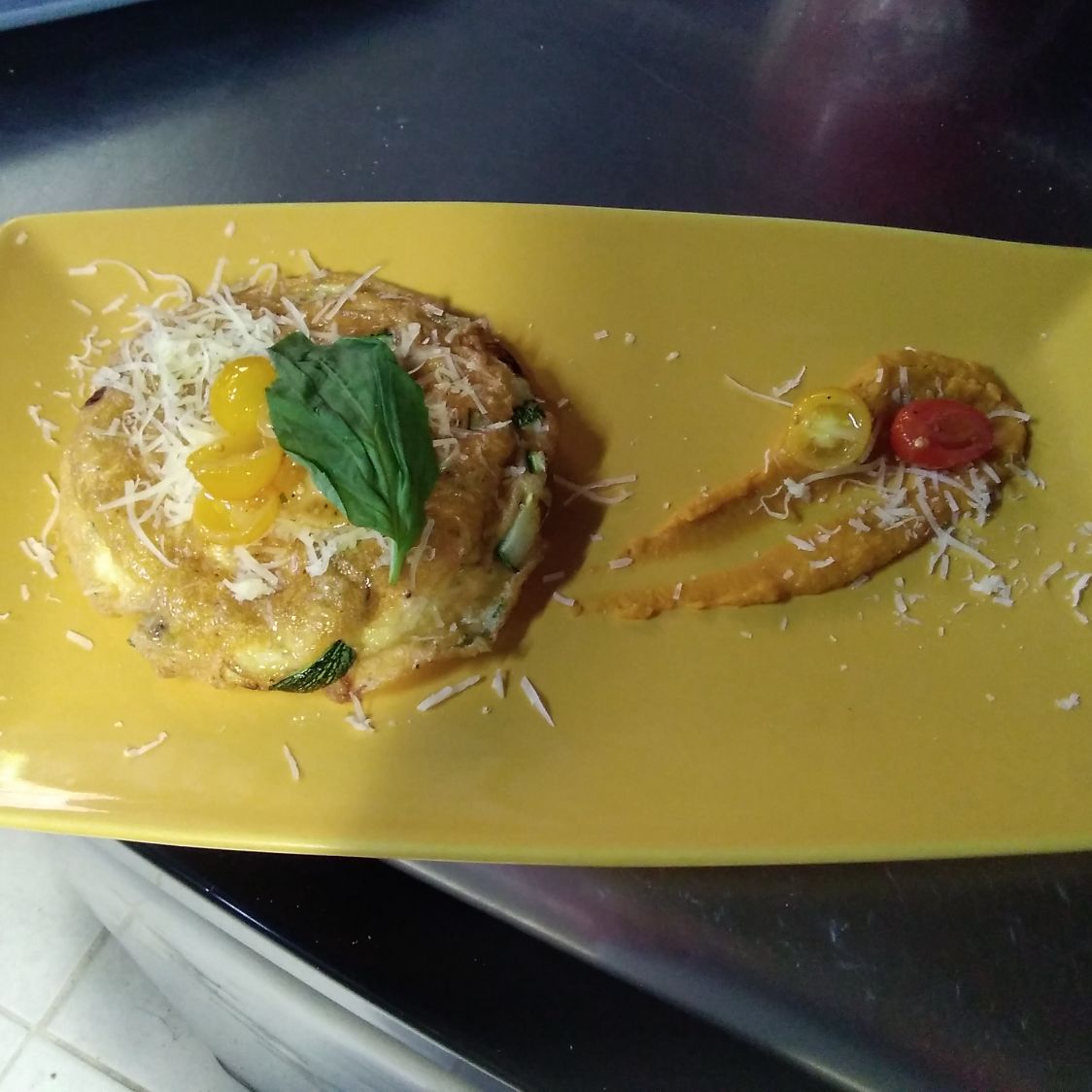 Esponjoso omelette, acompañado de calabaza, oliflor o papás al Romero. \ 250 grs.