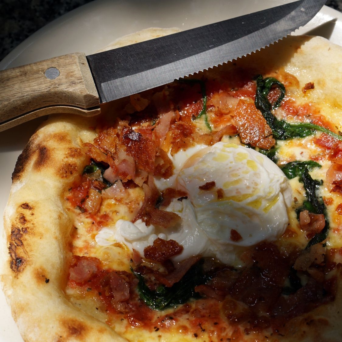 Pan de pizza con huevo poché, alsa pomodoro fresca, ueso mozzarella, espinacas salteadas con ajo y tocino crujiente. \ 250 grs.