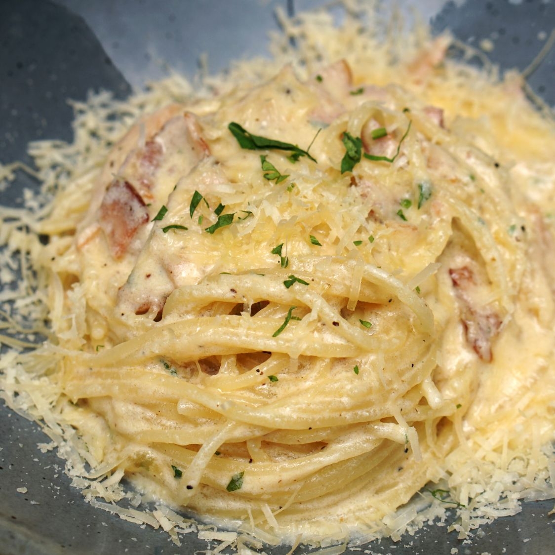 Clásica pasta italiana a base de huevo, tocino y fresco perejil. 244 gramos.