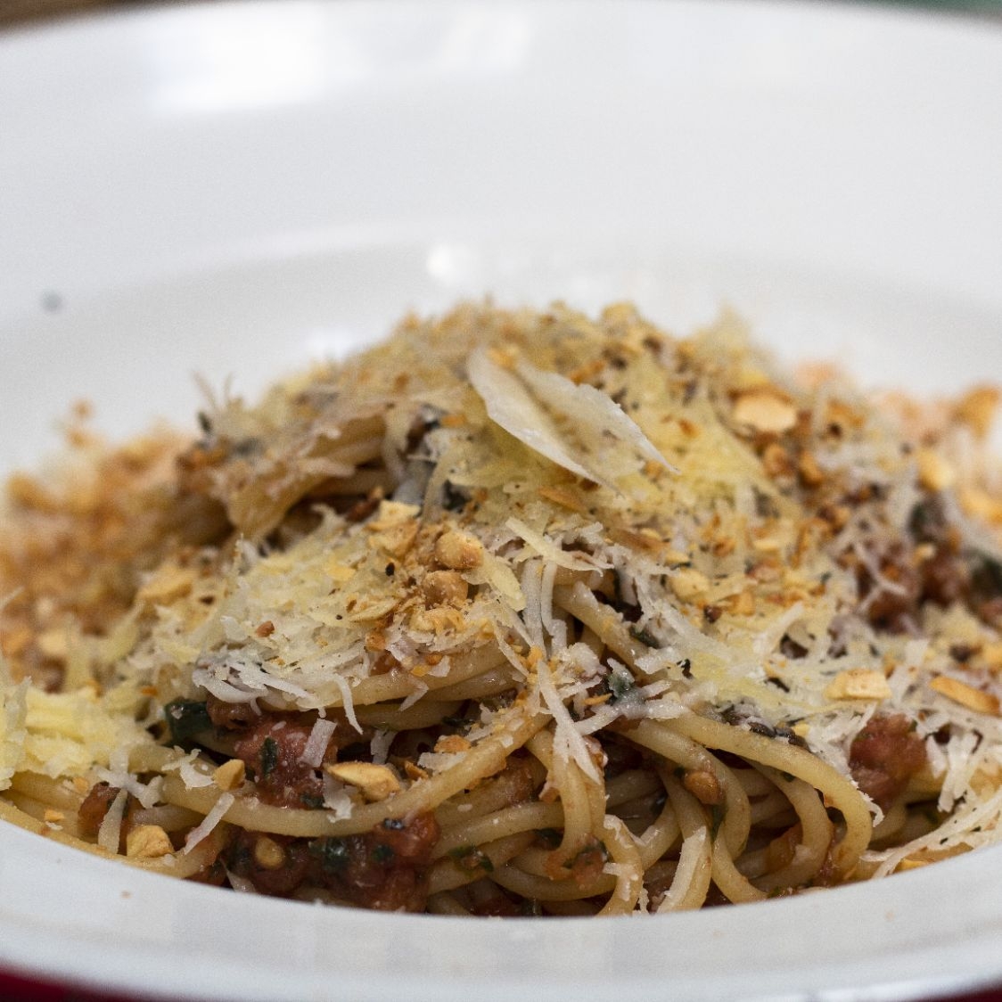 Pasta larga al pesto de pistache, con un toque de ajo, nuez y almendra, perfumado con menta y acompañada de queso parmesano. 200 gramos.