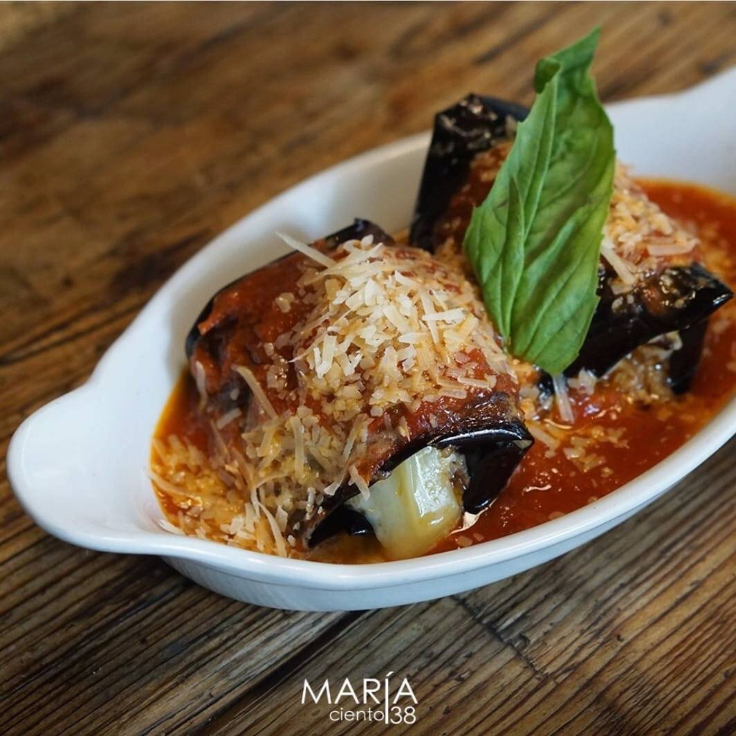 Láminas de berenjena rellena de queso parmesano, queso pecorino, mozzarella y piñones bañada en salsa de pomodoro. 170 gramos.