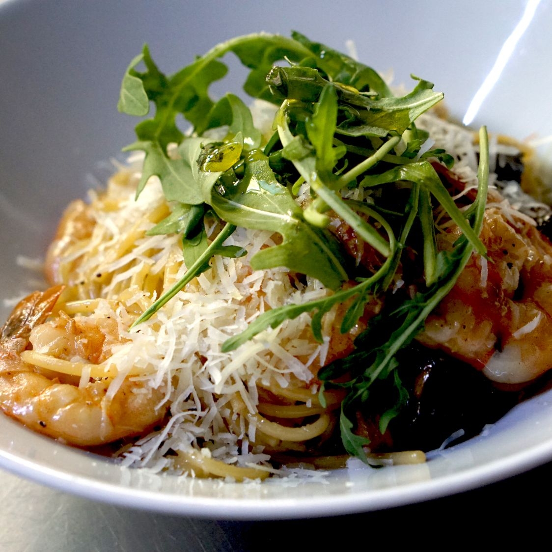 Spaguetti con camarones al vino blanco, hongos portobello, arugula y queso pecorino. 289 gramos.