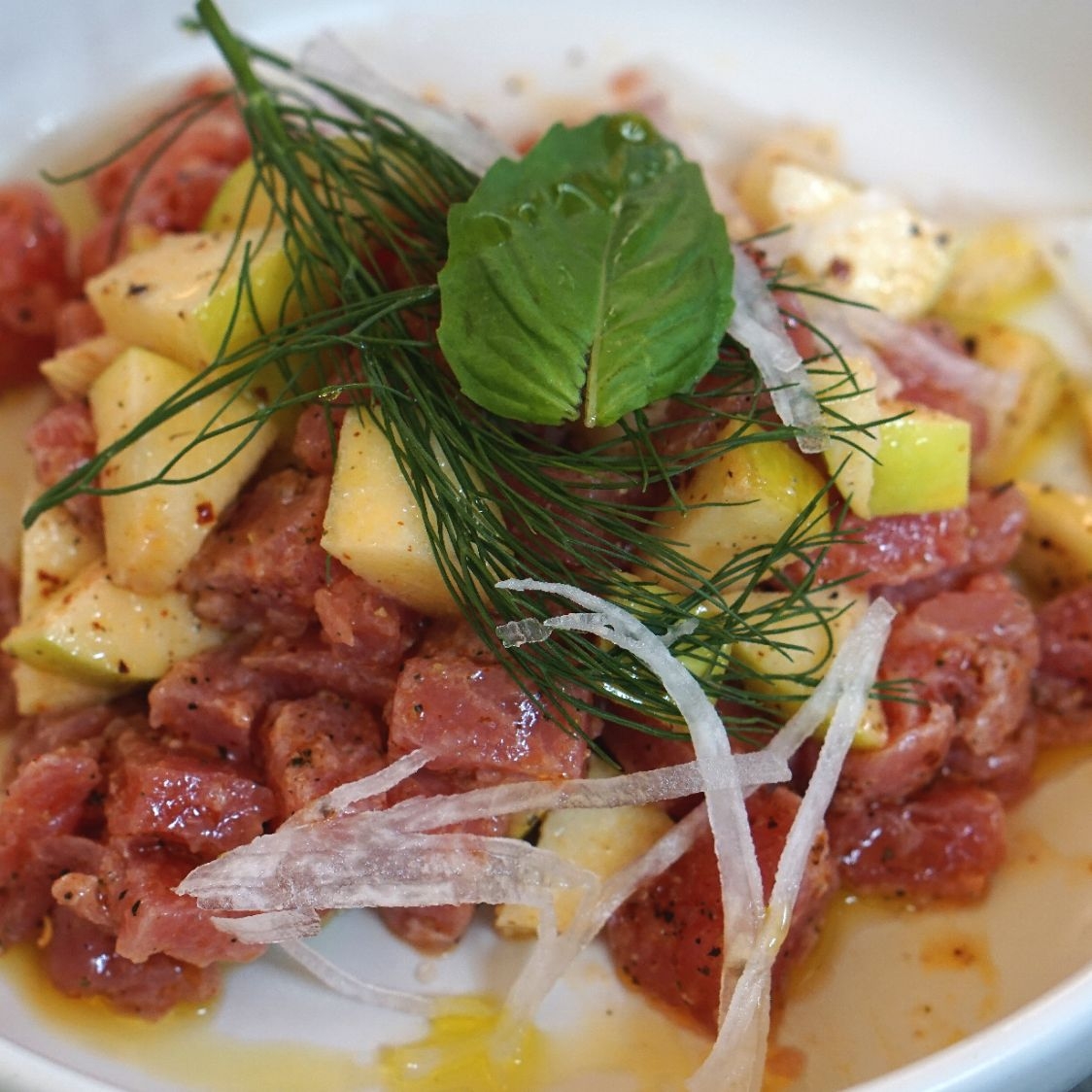 Atún marinado en jugo de limón amarillo, acompañado con manzana verde, albahaca, nabo y peperoncino. 310 gramos.