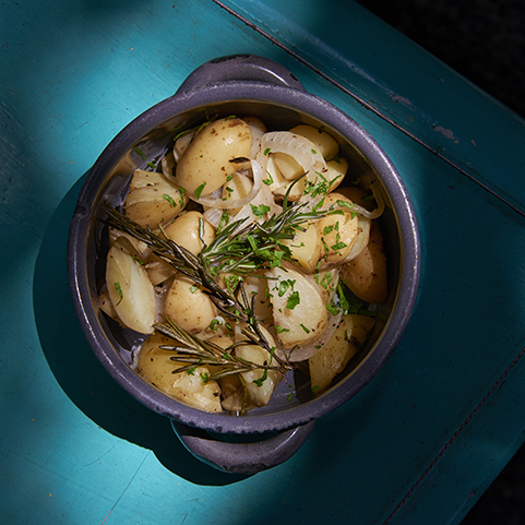 Papas cambray horneadas lentamente a la leña, acompañadas con romero y cebolla. 120 gramos.