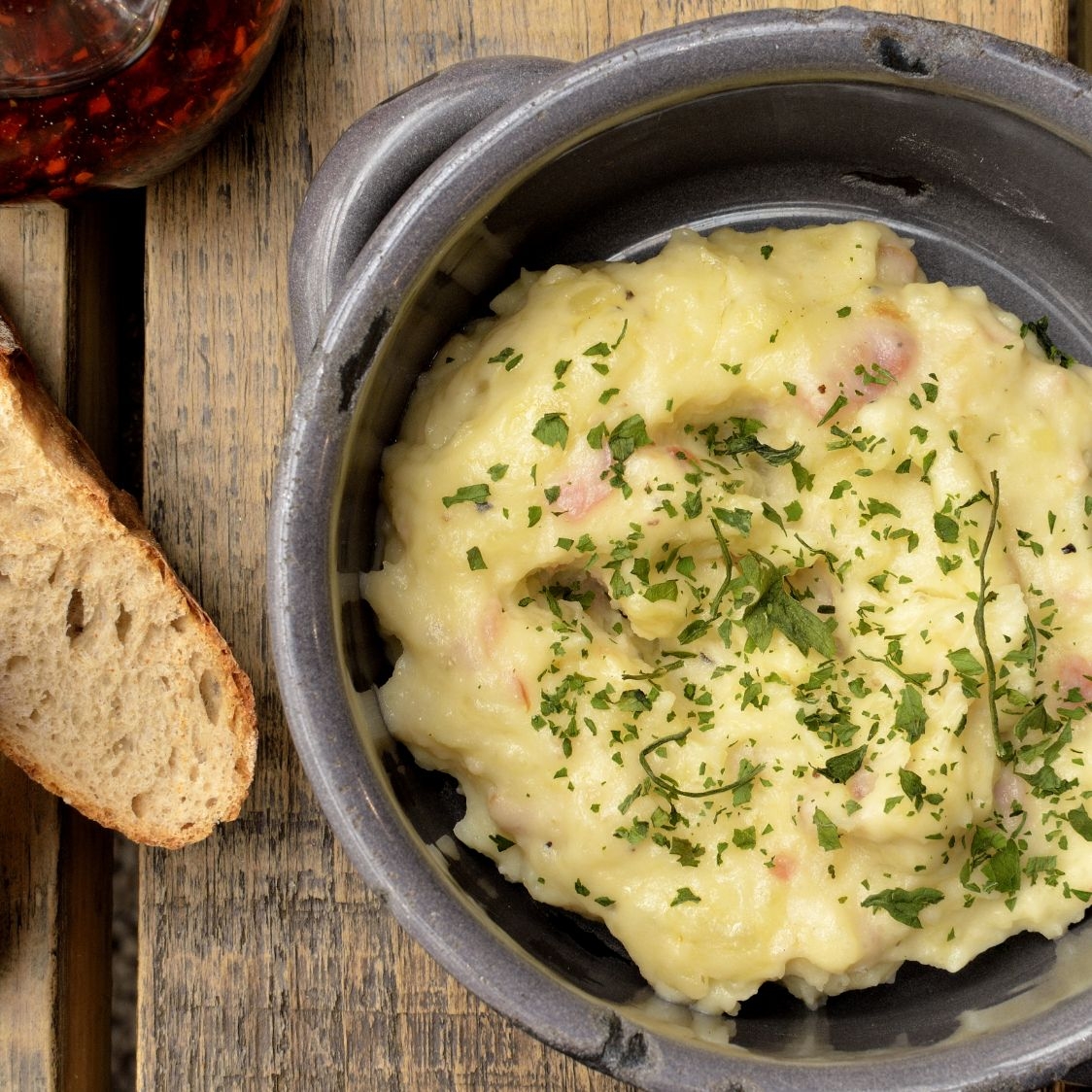 Artesanal puré de papas con tocino y un toque de mantequilla. 120 gramos.