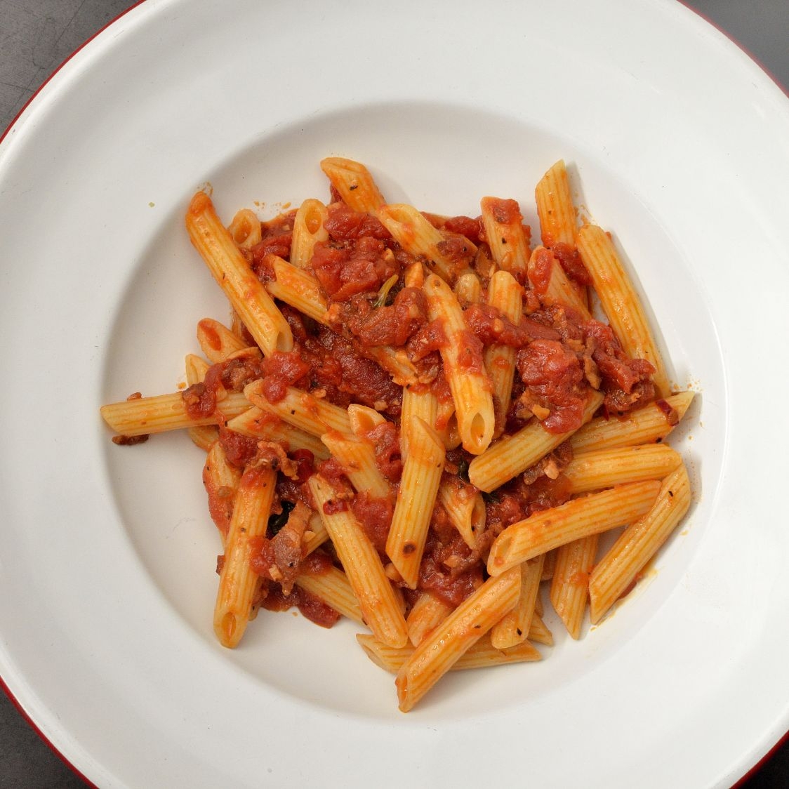 Pasta pluma con pomodoro sazonado, peperoncino, tocino frito, ajo y albahaca.