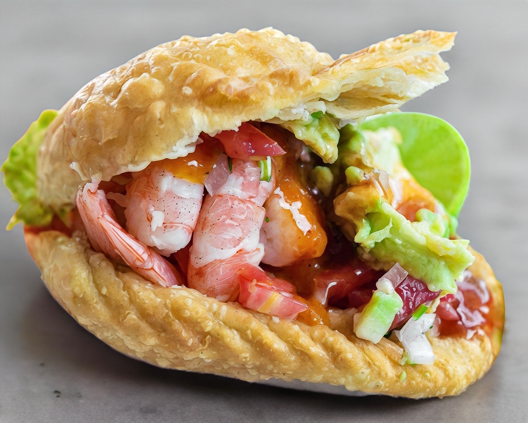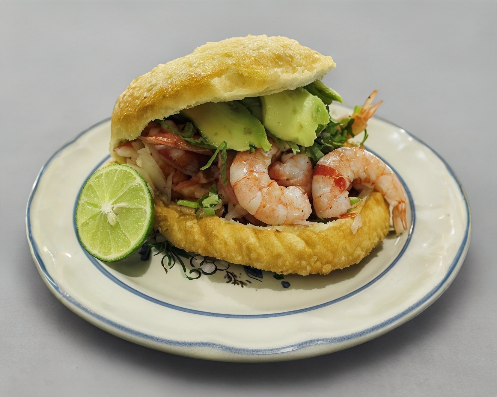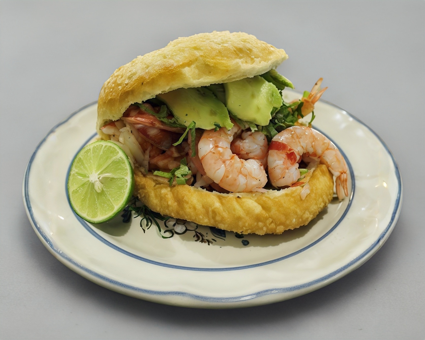 Empanada de camaron con una cama de mayonesa y verduras (jitomate, cebolla, aguacate y cilantro), limones y salsa por aparte.
