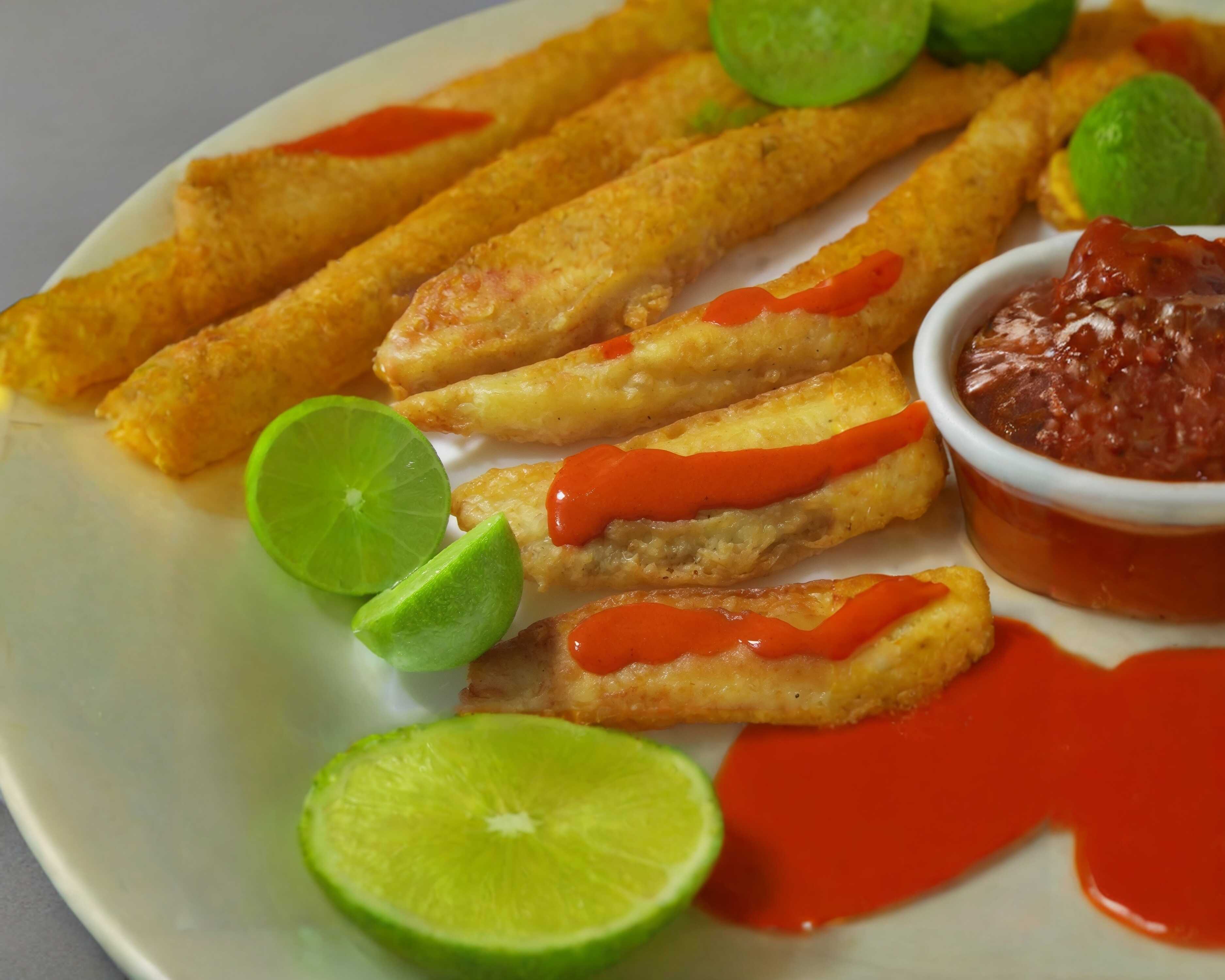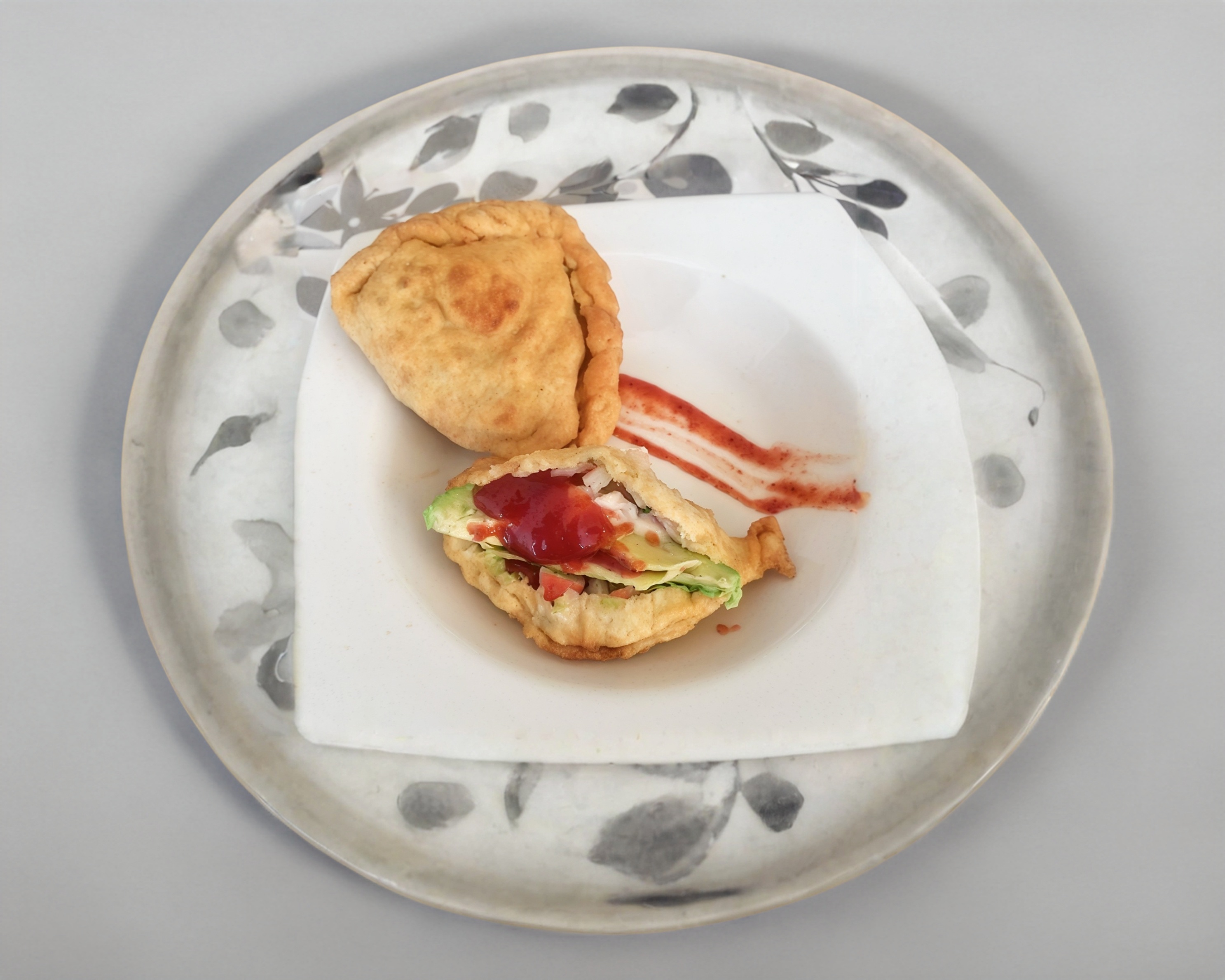 Empanada de surimi con una cama de mayonesa y verduras (jitomate, cebolla, aguacate y cilantro), limones y salsa por aparte.