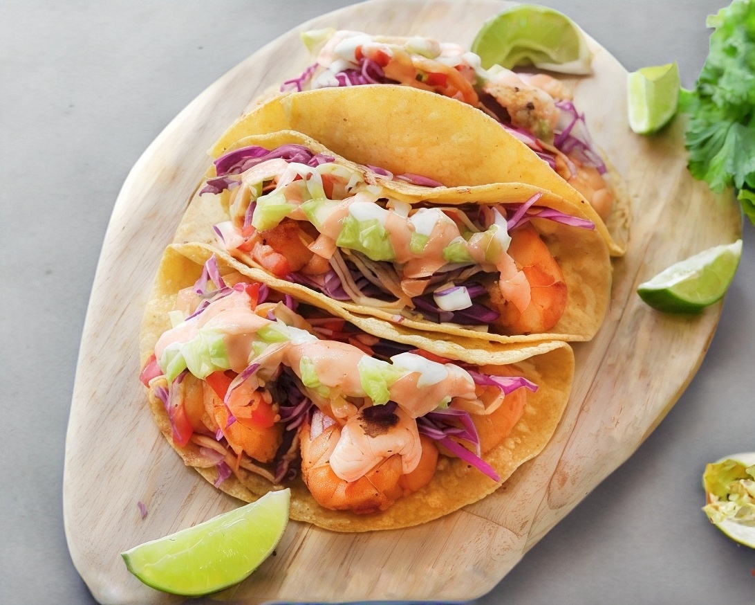 Taco de camarón tipo ensenada. Tortilla de harina con camarones capeados sobre una cama de mayonesa y verduras (jitomate, cebolla y cilantro) y por encima aguacate. Limones y salsas por aparte.