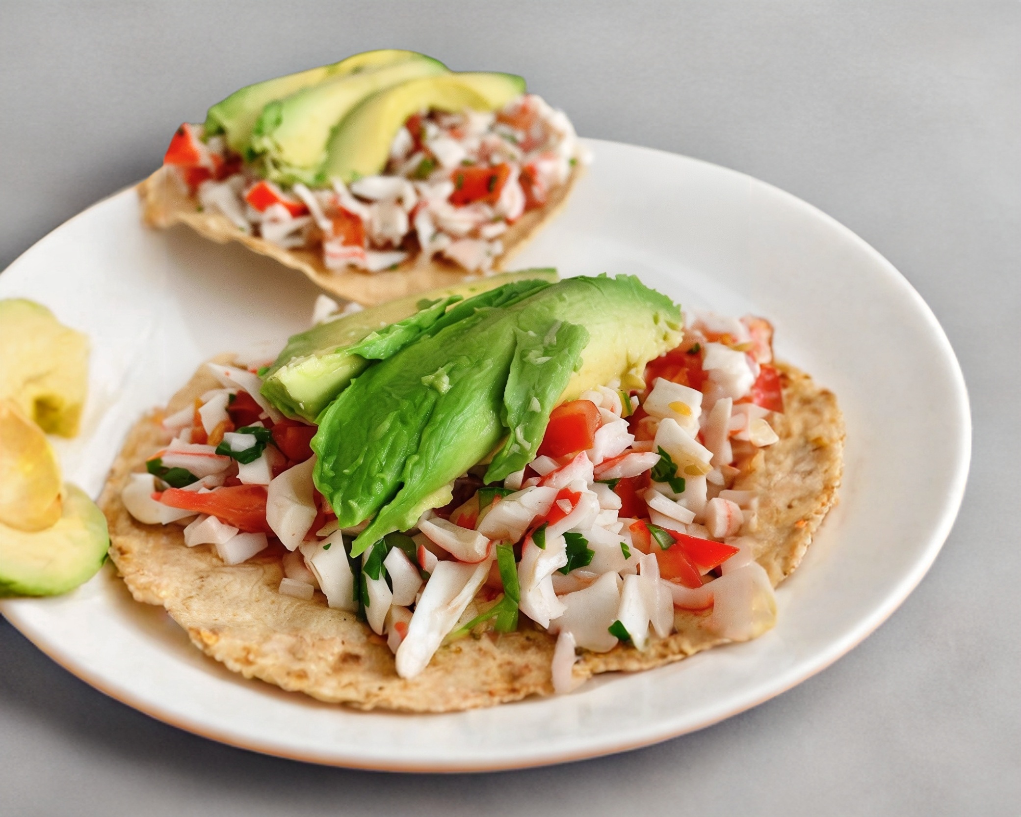 Tostada de surimi con una cama de mayonesa y verduras (jitomate, cebolla, aguacate y cilantro), limones y salsa por aparte.