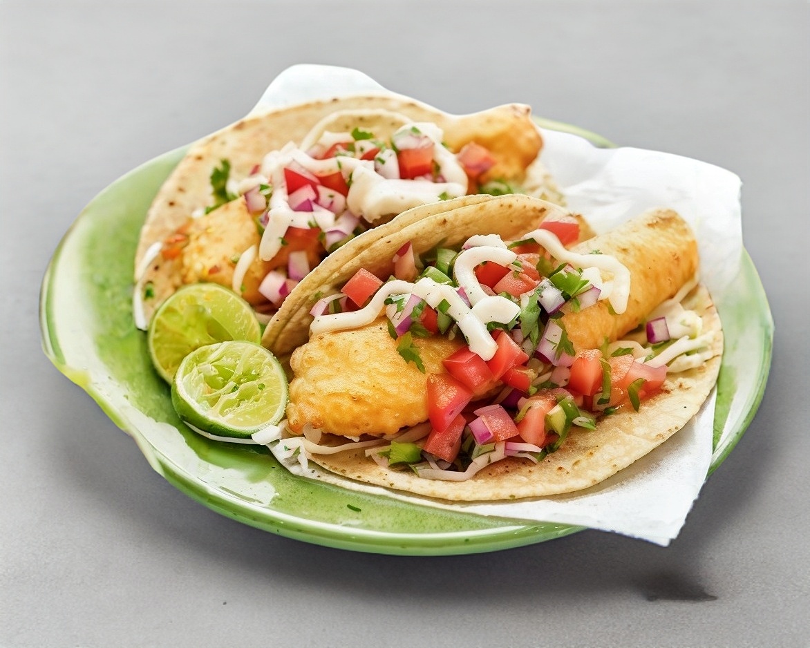 Taco de pescadito tipo ensenada. Tortilla de harina con pescadito capeado y Queso Manchego sobre una cama de mayonesa y verduras (jitomate, cebolla y cilantro) y por encima aguacate. Limones y salsas por aparte.
