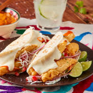 Taco de camarón con queso manchego tipo ensenada. Tortilla de harina con camarones capeados sobre una cama de mayonesa y verduras (jitomate, cebolla y cilantro) y por encima aguacate. Limones y salsas por aparte.