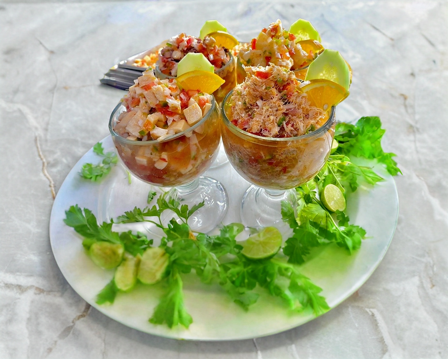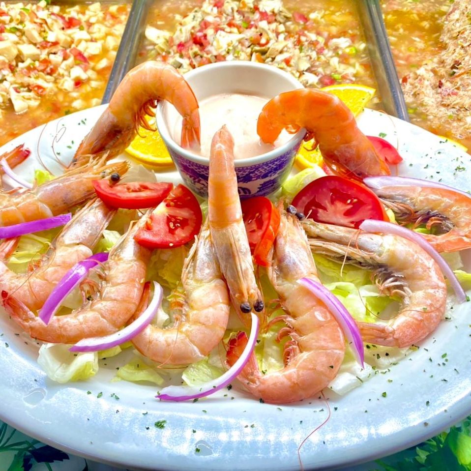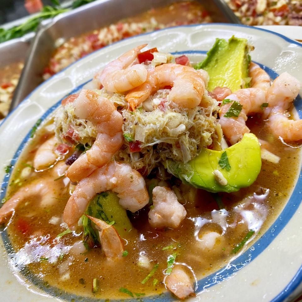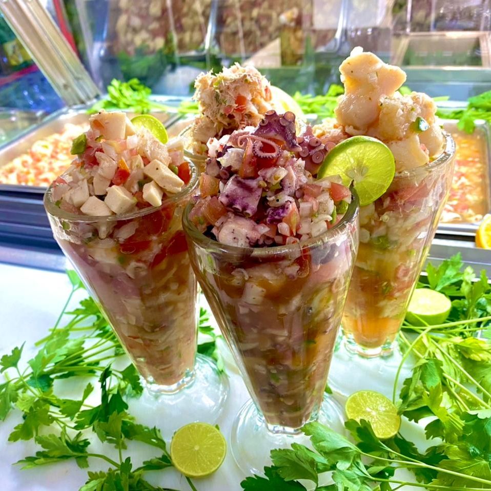 Todos los ceviches,ostion y camarón preparados con cátsup, cilantro y aguacate