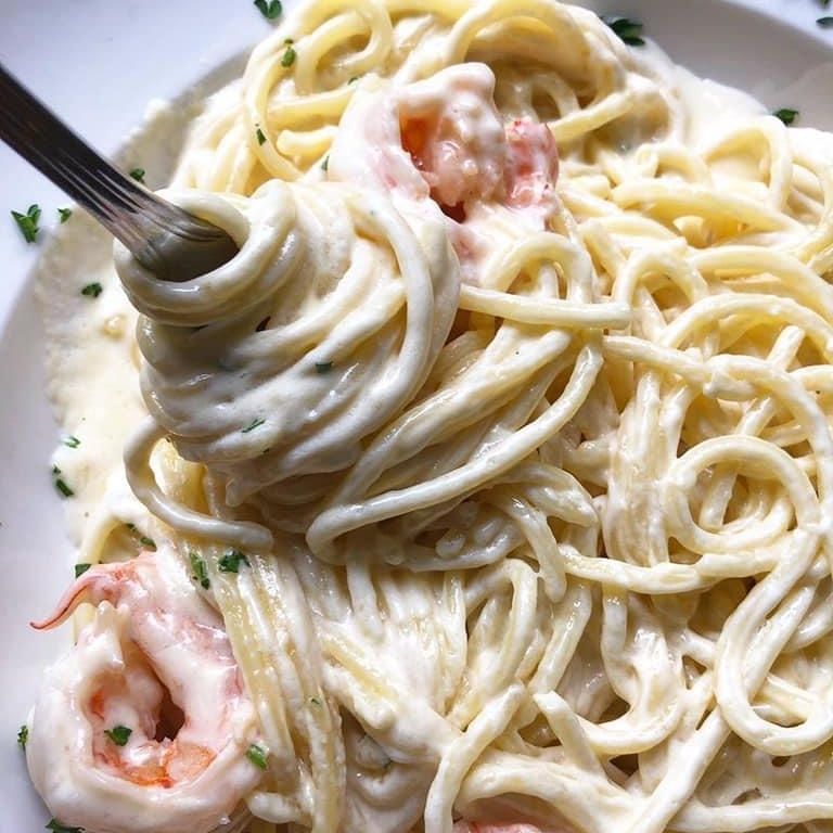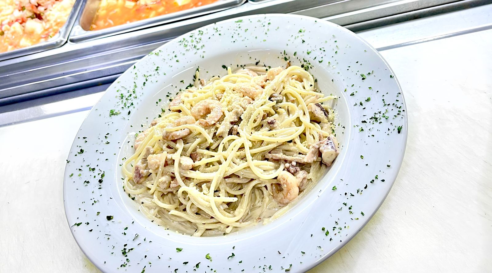 Camarón, pulpo, tocino, salsa de queso philadelplia con un toque de parmesano