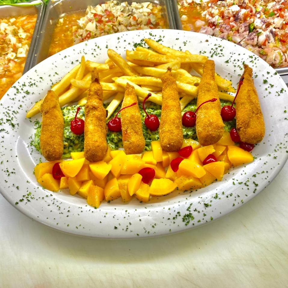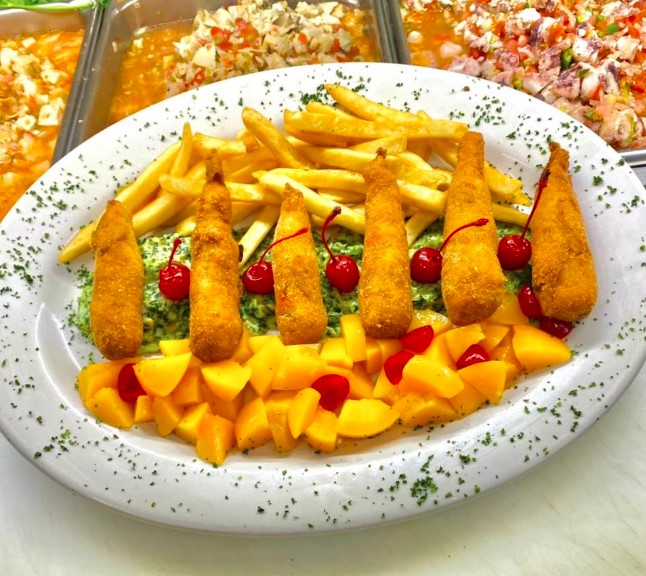 Rellenos de queso oaxaca con un toque de chipotle empanizados sobre una base de crema de espinacas acompañado de papas y coctel de frutas