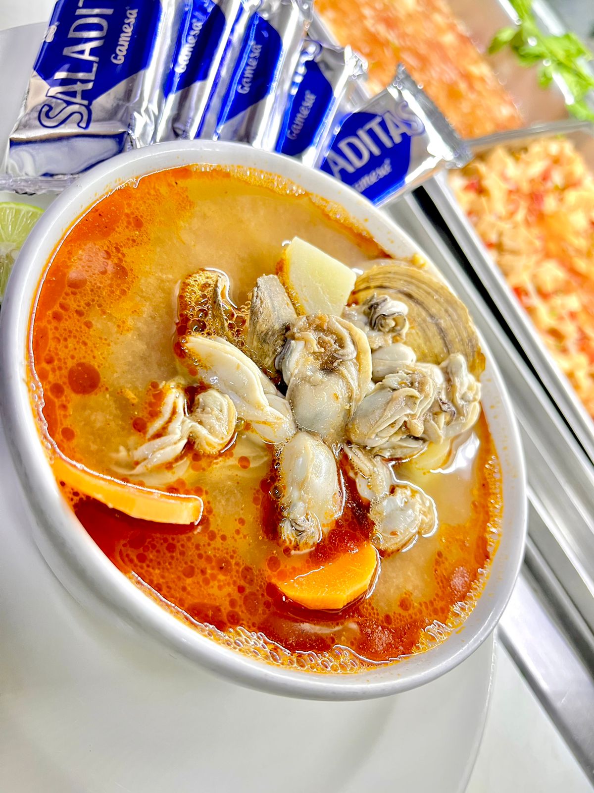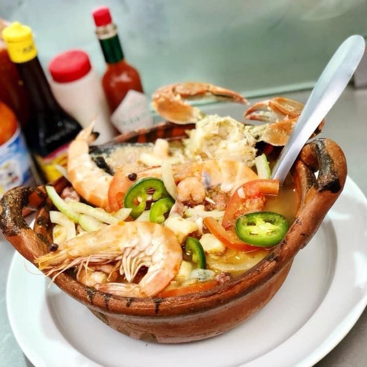 Jaiba, ostion, pulpo, camarón, calamar, pescado, Jaiba concha, Almeja, papa y zanahoria