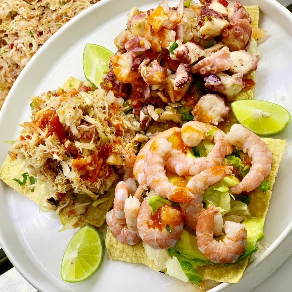 A elegir: pulpo, pez, jaiba o calamar, con cátsup, cilantro y aguacate.