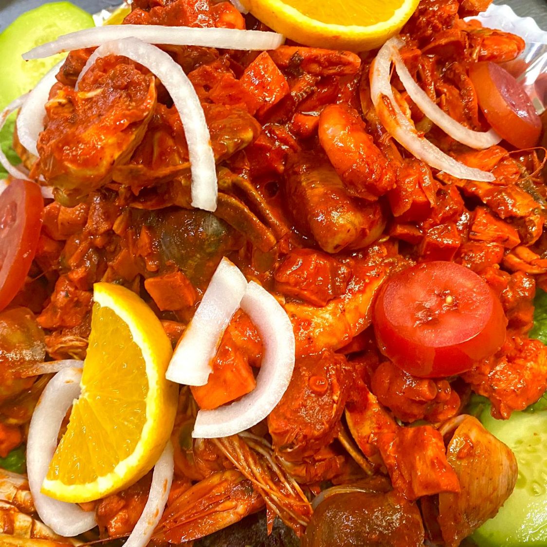 Calamar, pulpo, Jaiba concha, camarón para pelar y pelado, almeja y de base una mojarra sazonado con ingredientes especiales de la casa y paprika