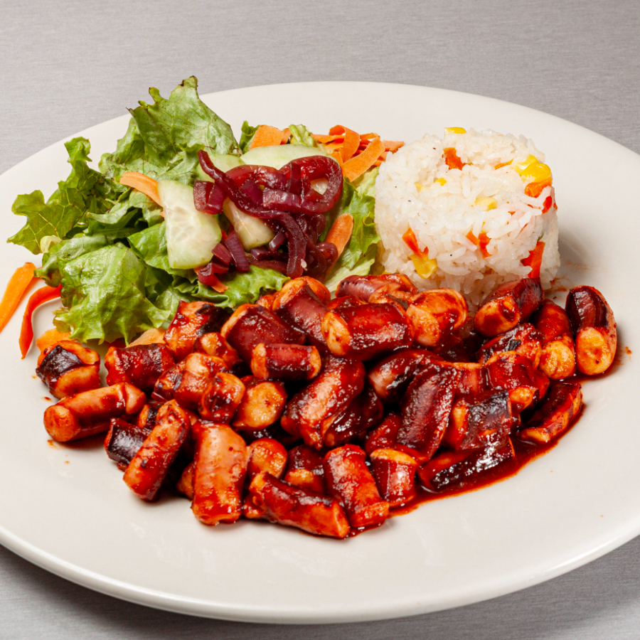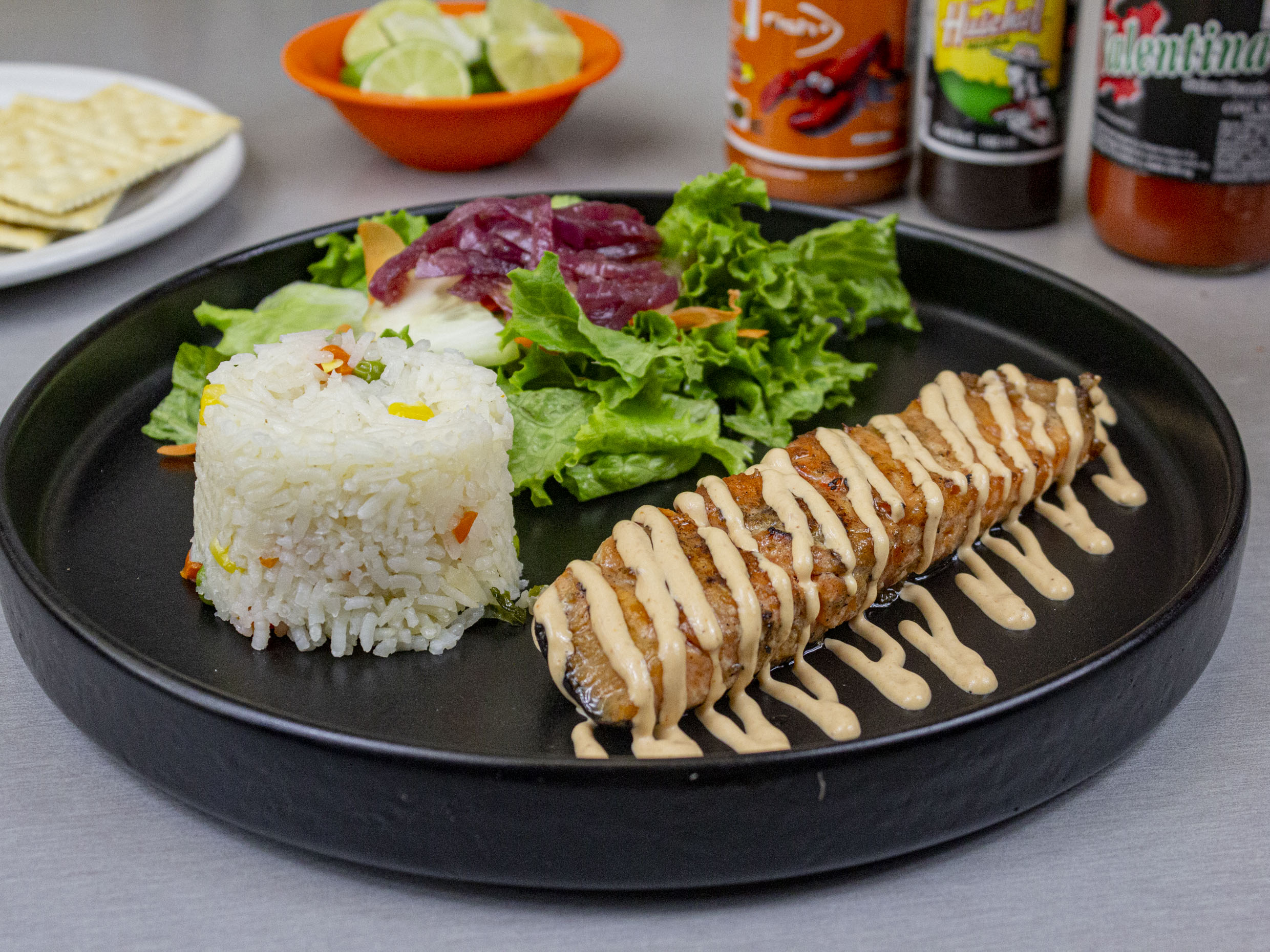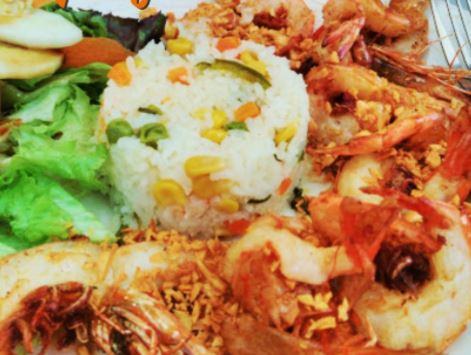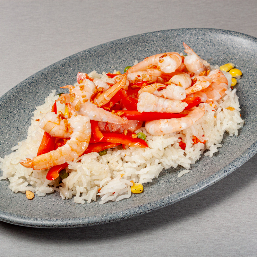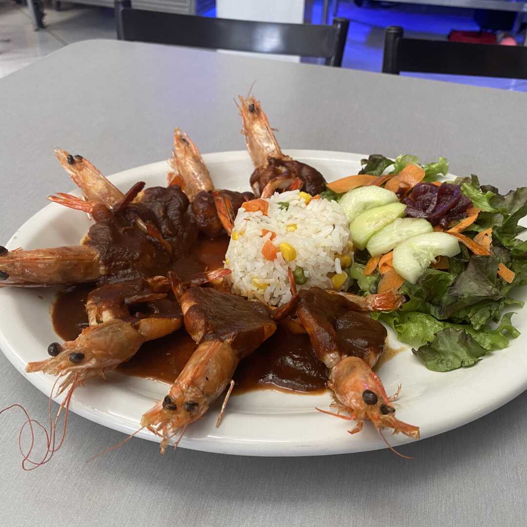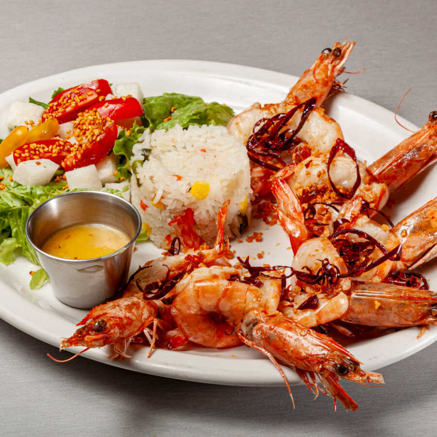 180gr Arroz y ensalada. Va al carbón y lleva un aderezo de camarón
