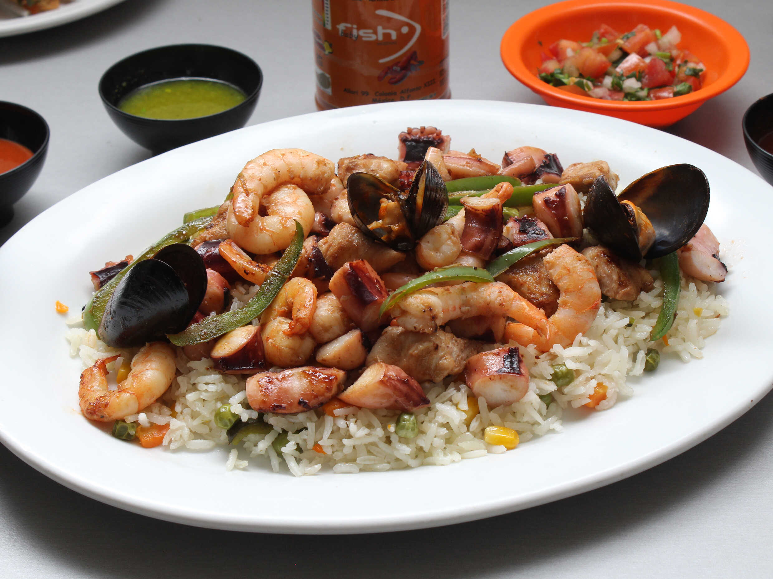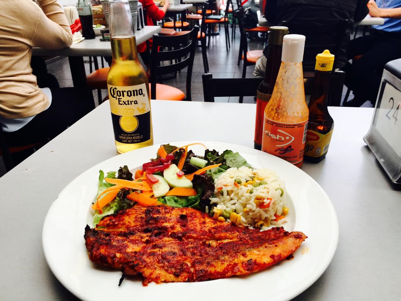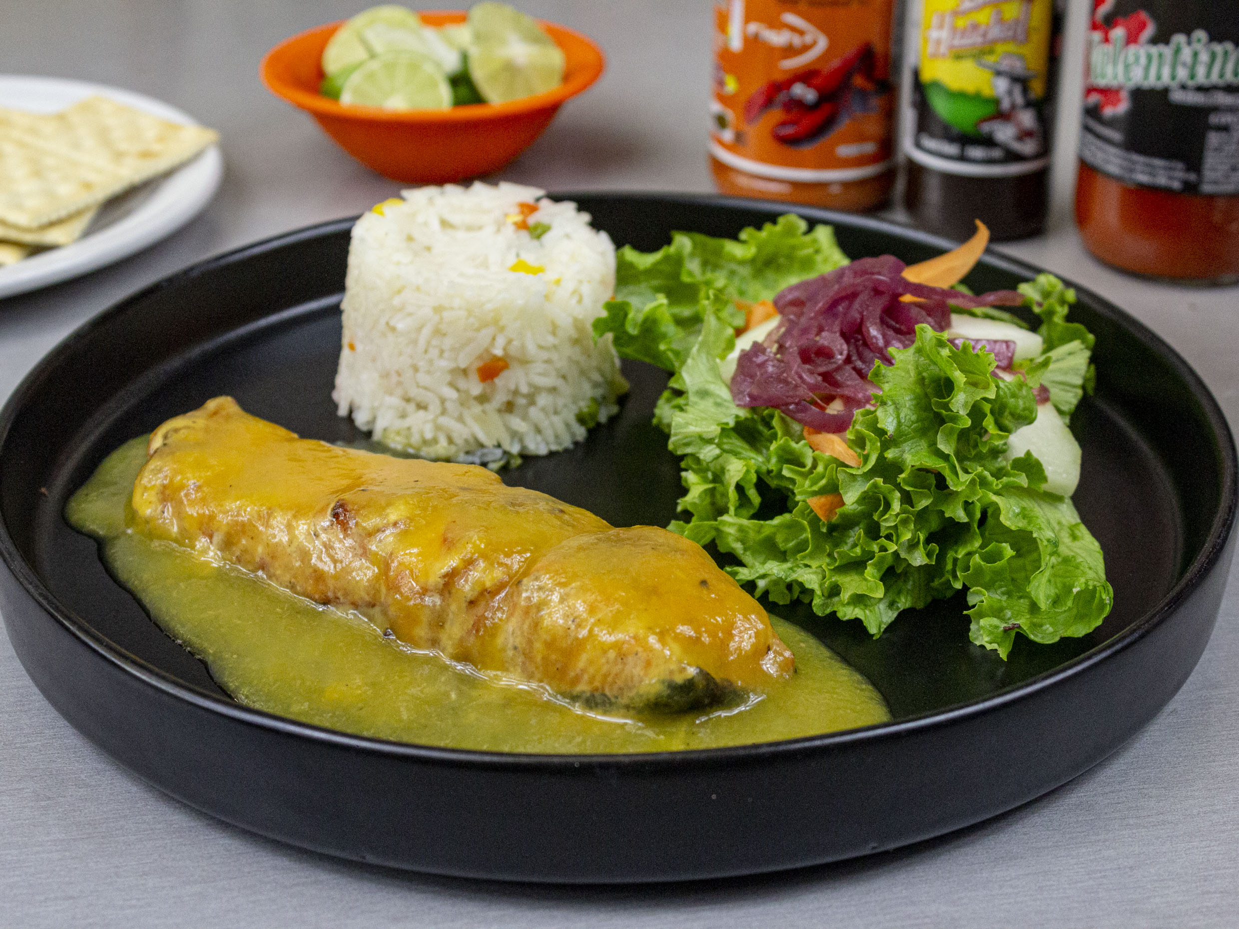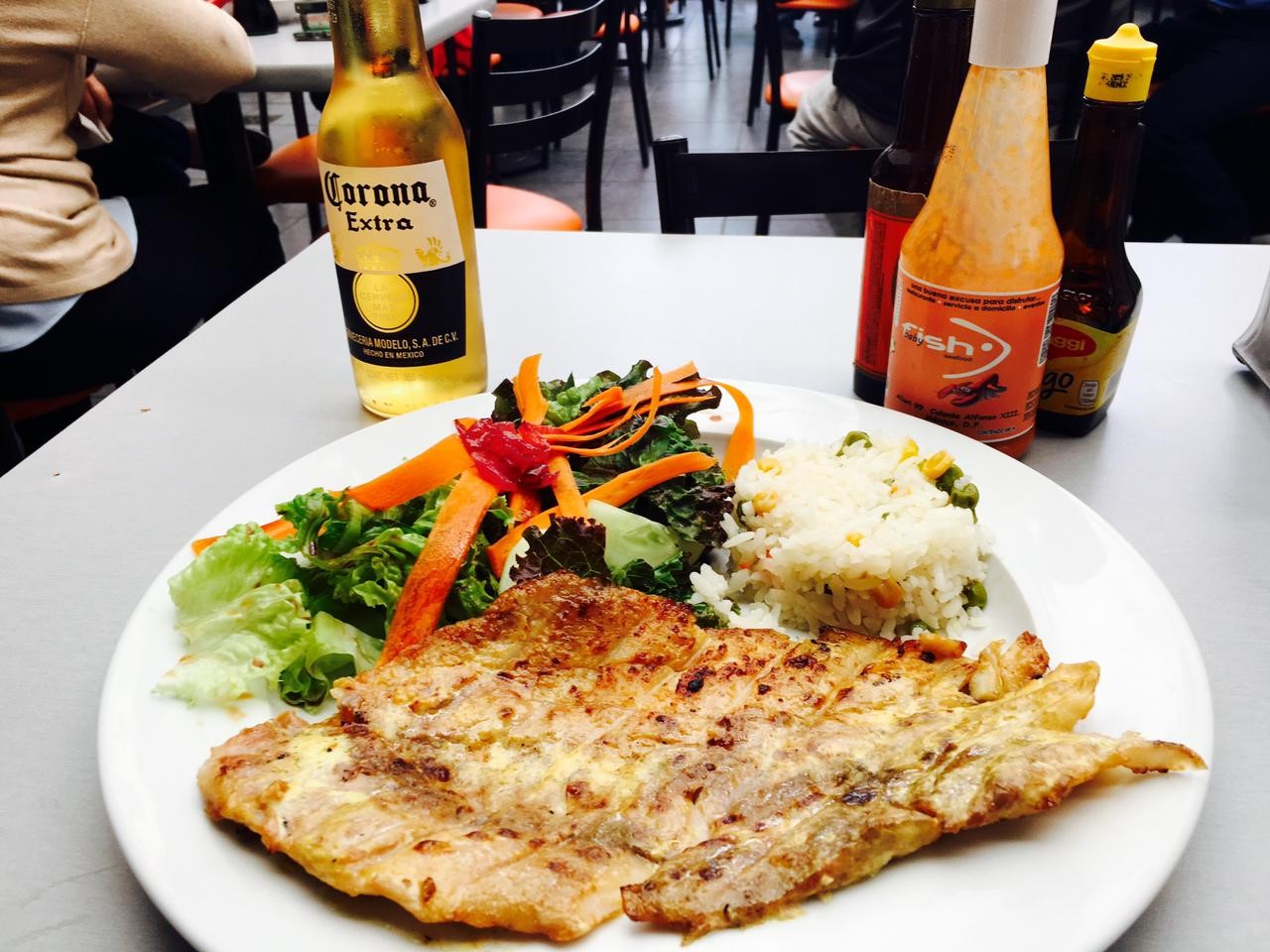 180gr Arroz y ensalada. Va al carbón y lleva un aderezo de camarón