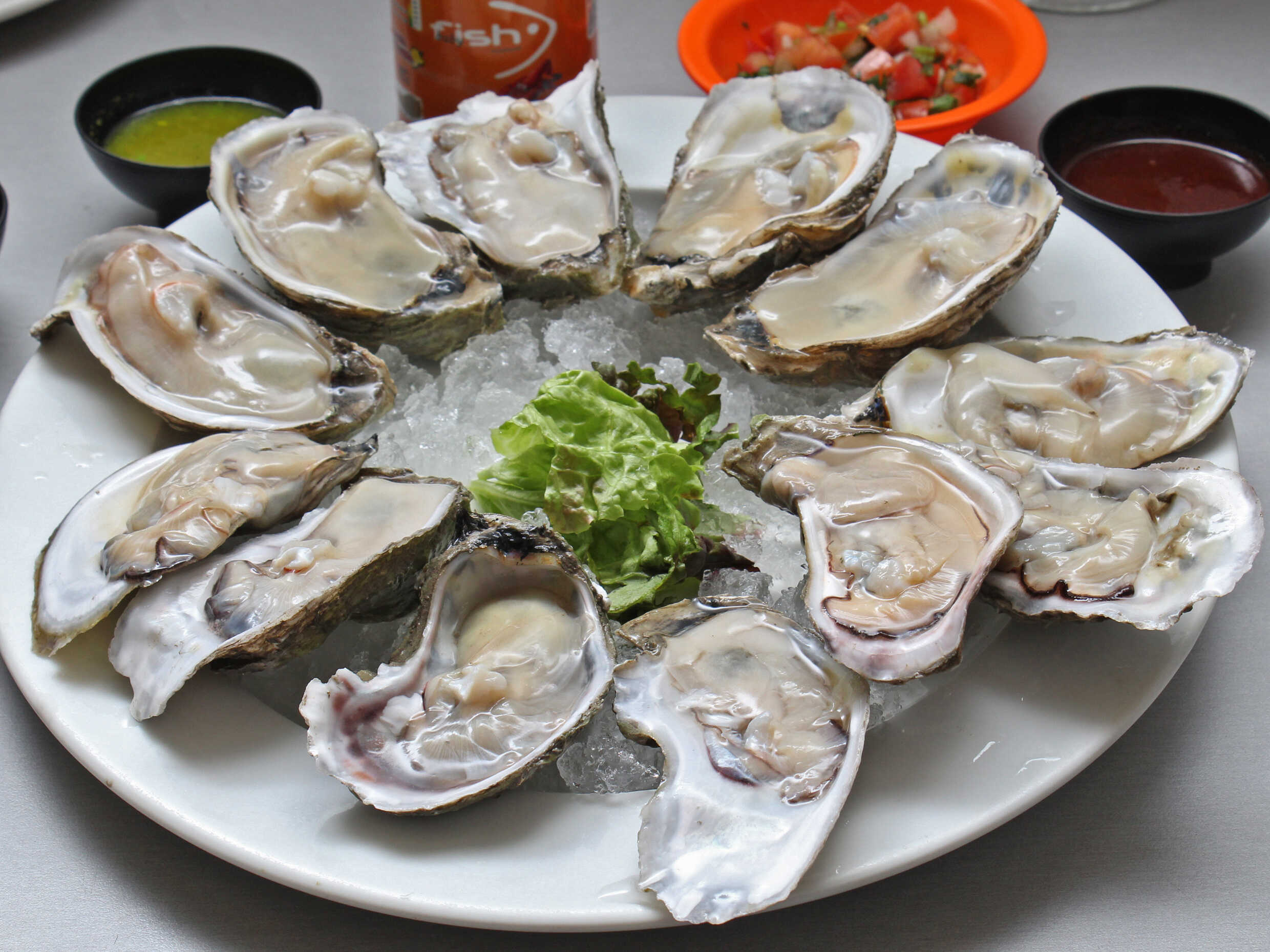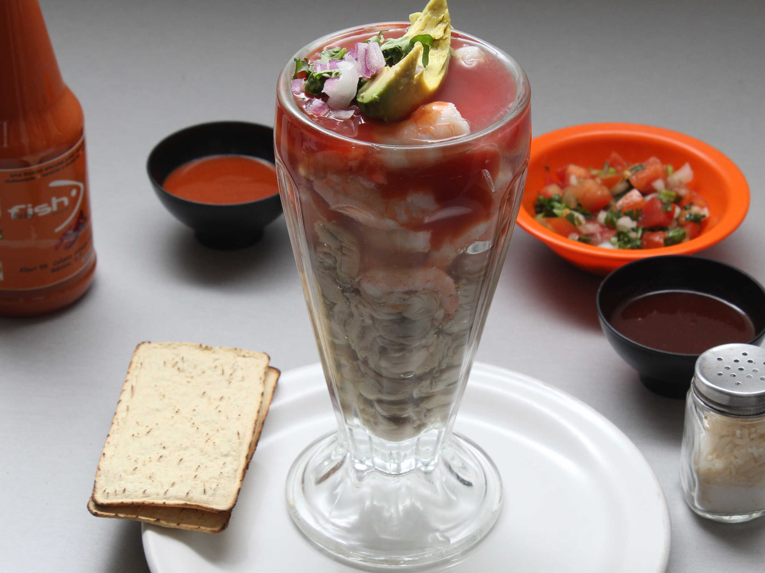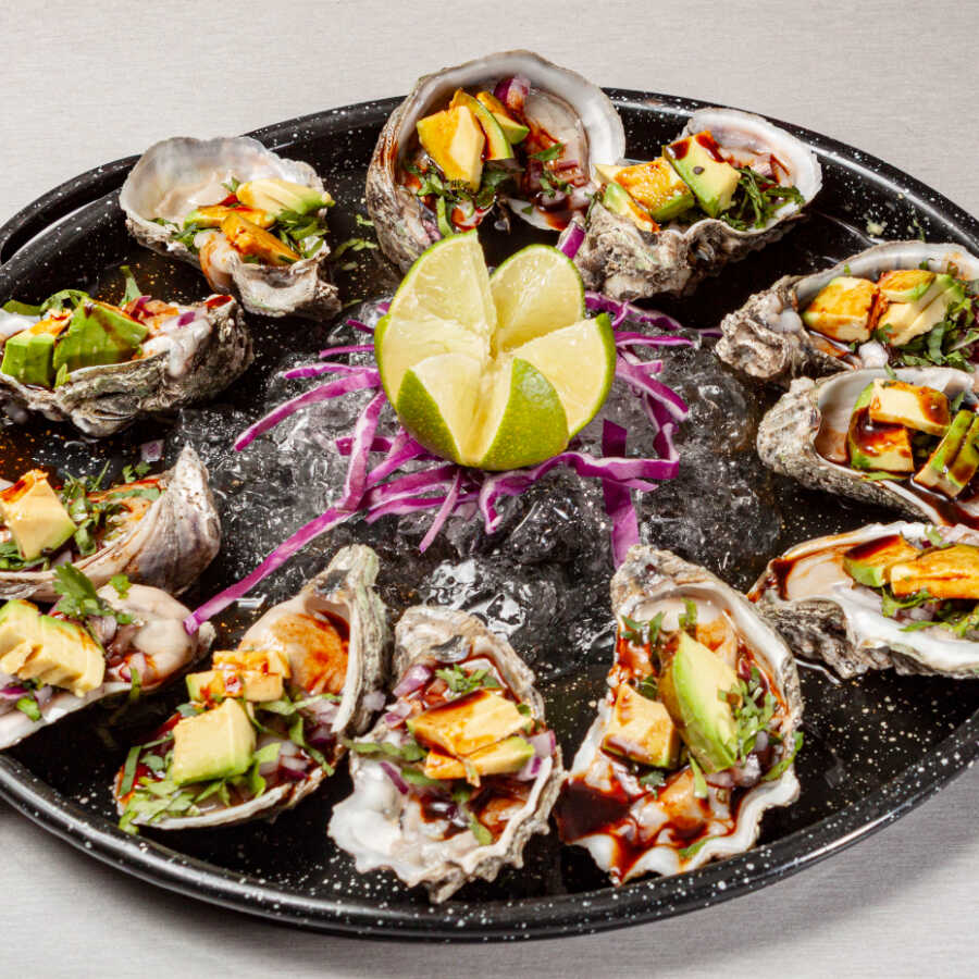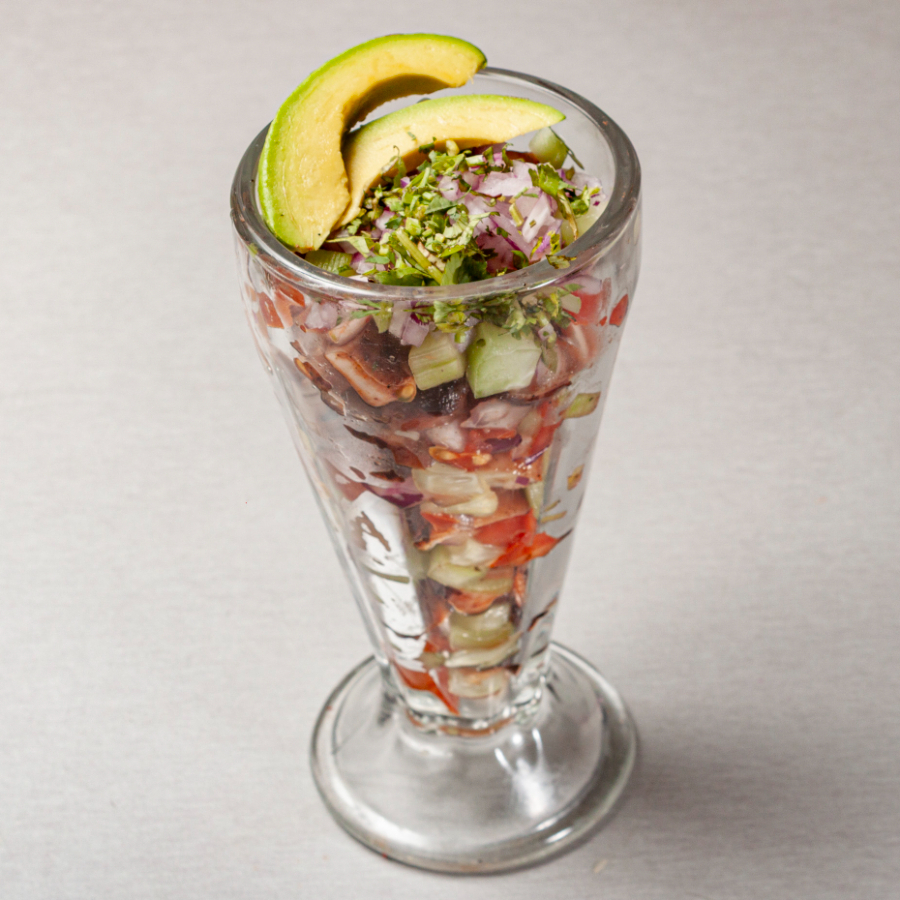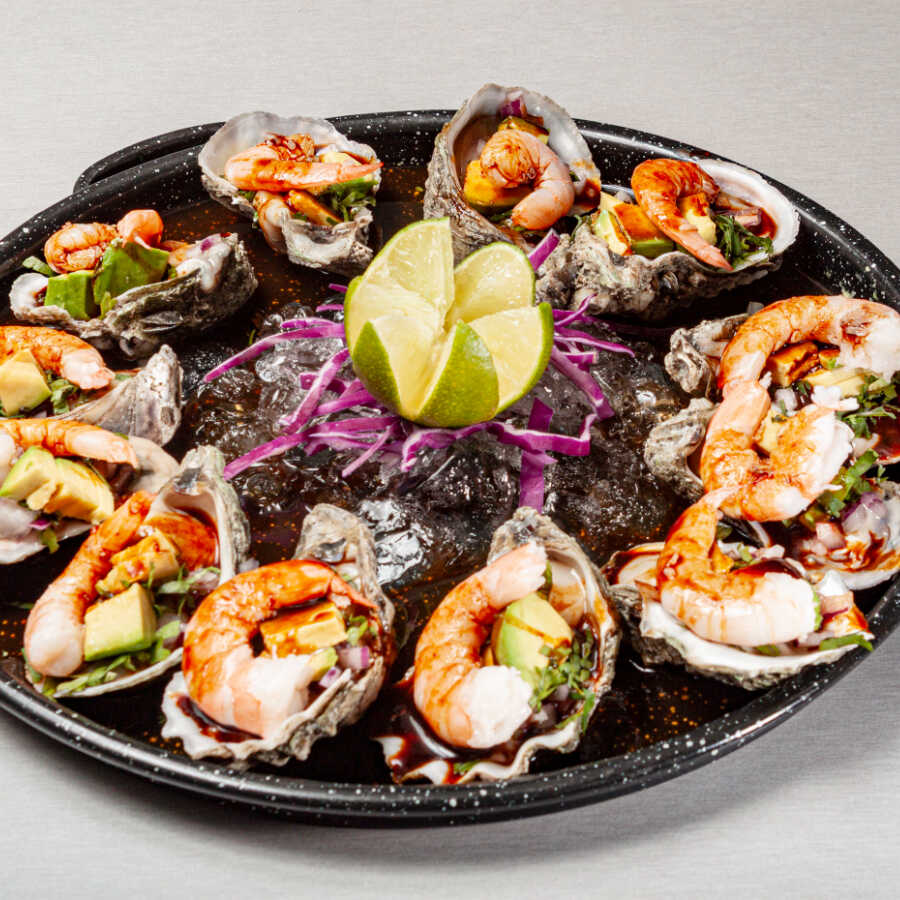 Camarón pacotilla y ostión con cátsup de la casa, cebolla, aguacate y aceite olivo.