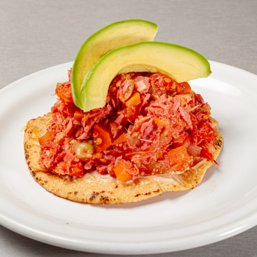 1pz Marlin guisado sobre una tostada con mayonesa,cilantro,cebolla morada y aguacate.