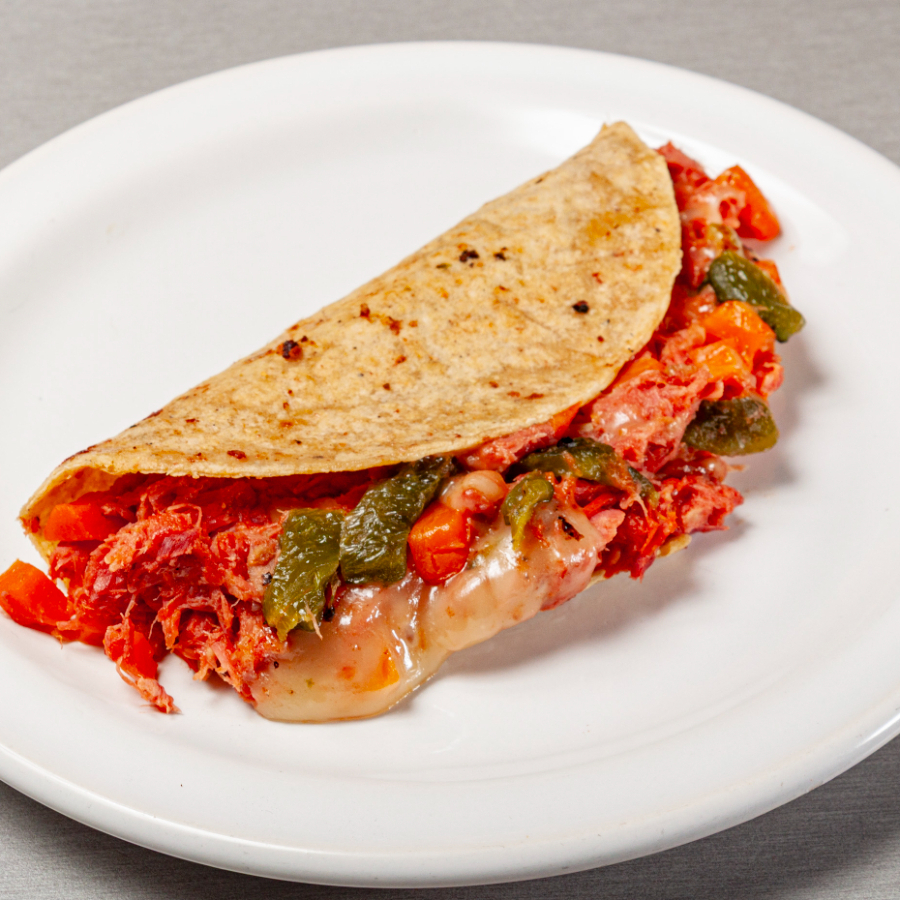 Tortilla de maíz con marlin guisado, rajas poblanas y queso manchego.