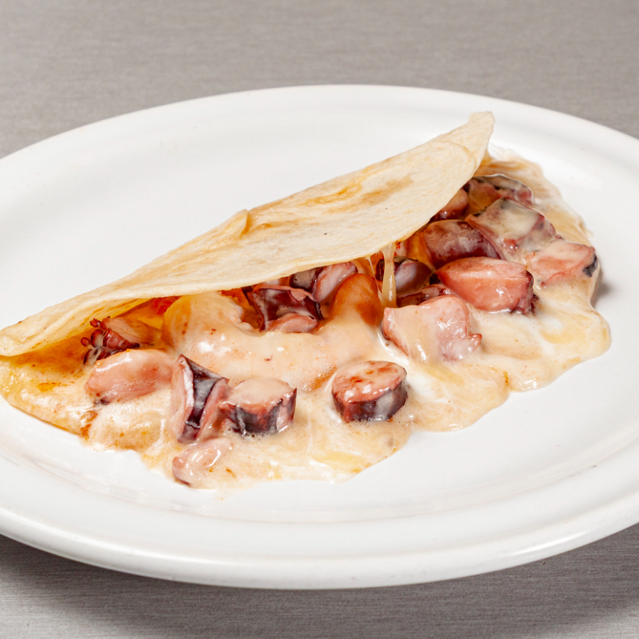1 pz 40gr Tortilla de harina rellena de camarón,pulpo,crema y queso manchego.