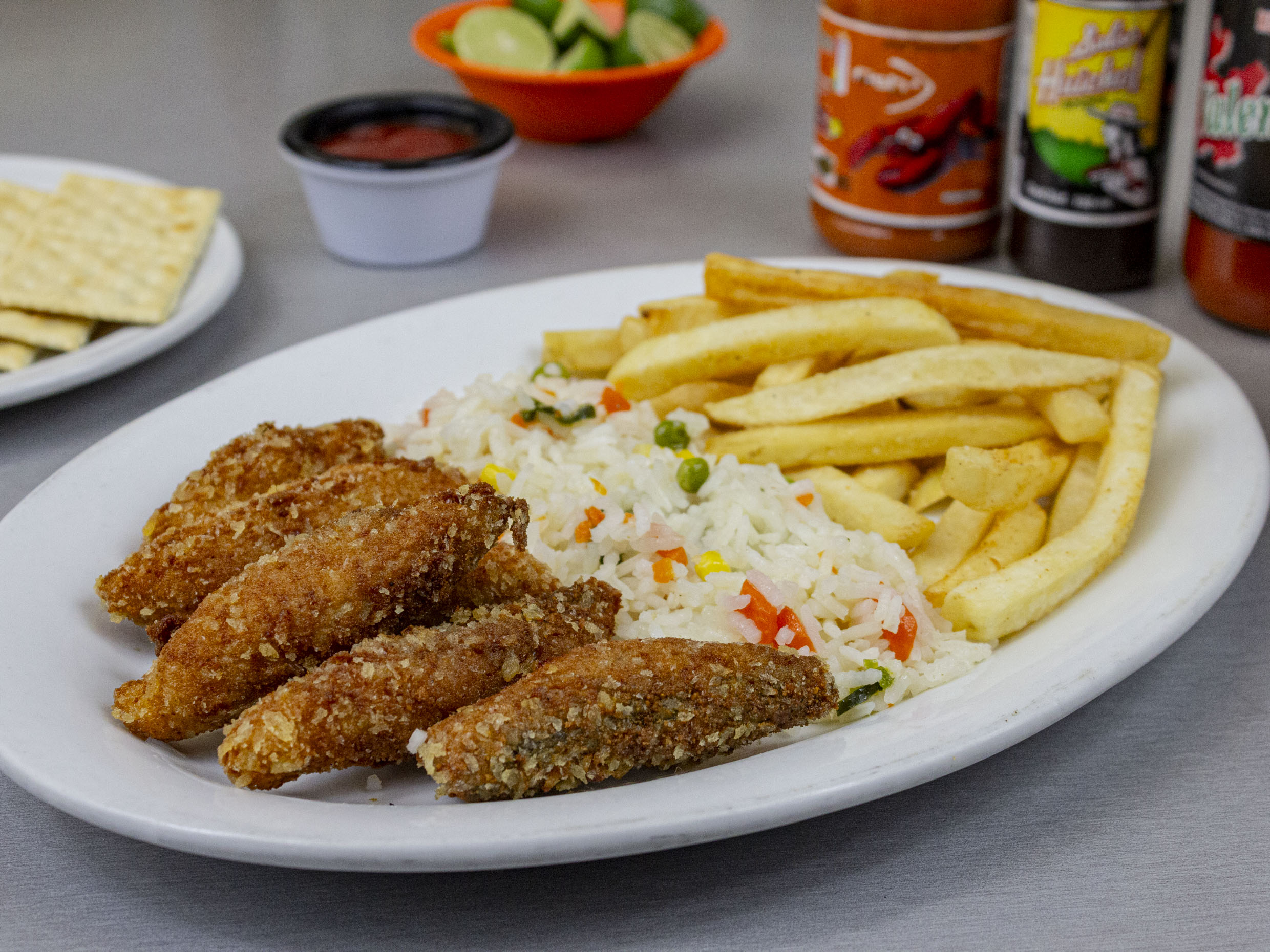 Acompañado de arroz y papas 6pz