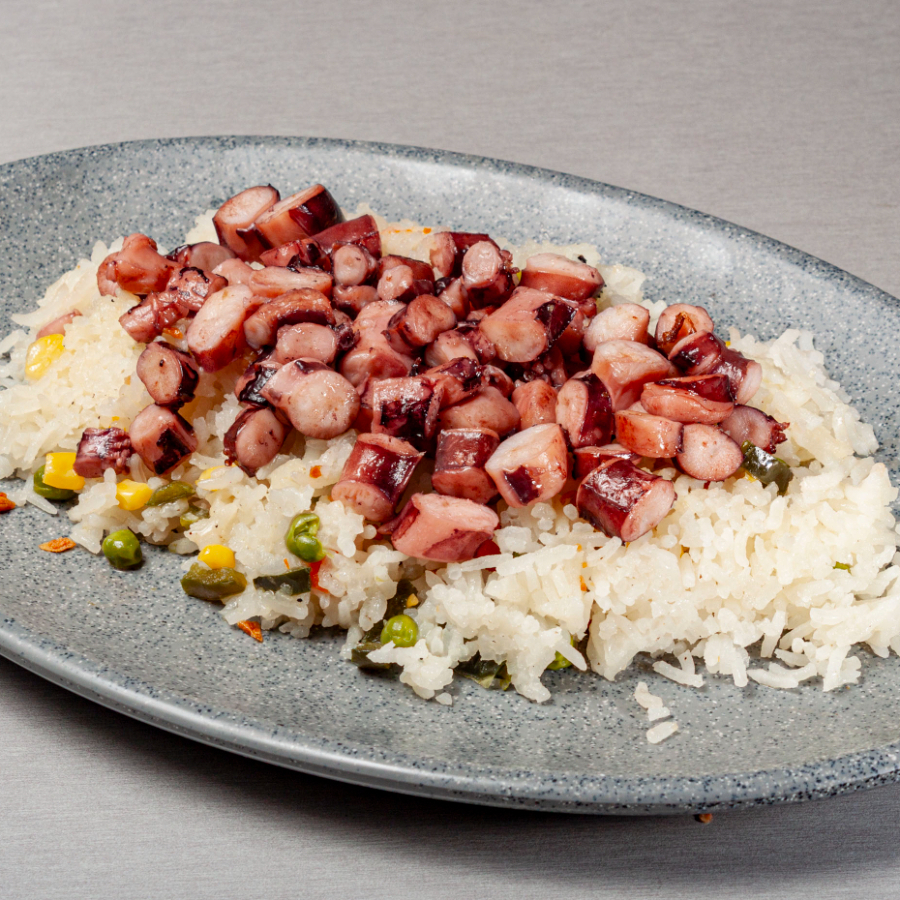 160gr Relleno de Camarón y Pulpo con aderezo de camarón acompañado de arroz y ensalada.