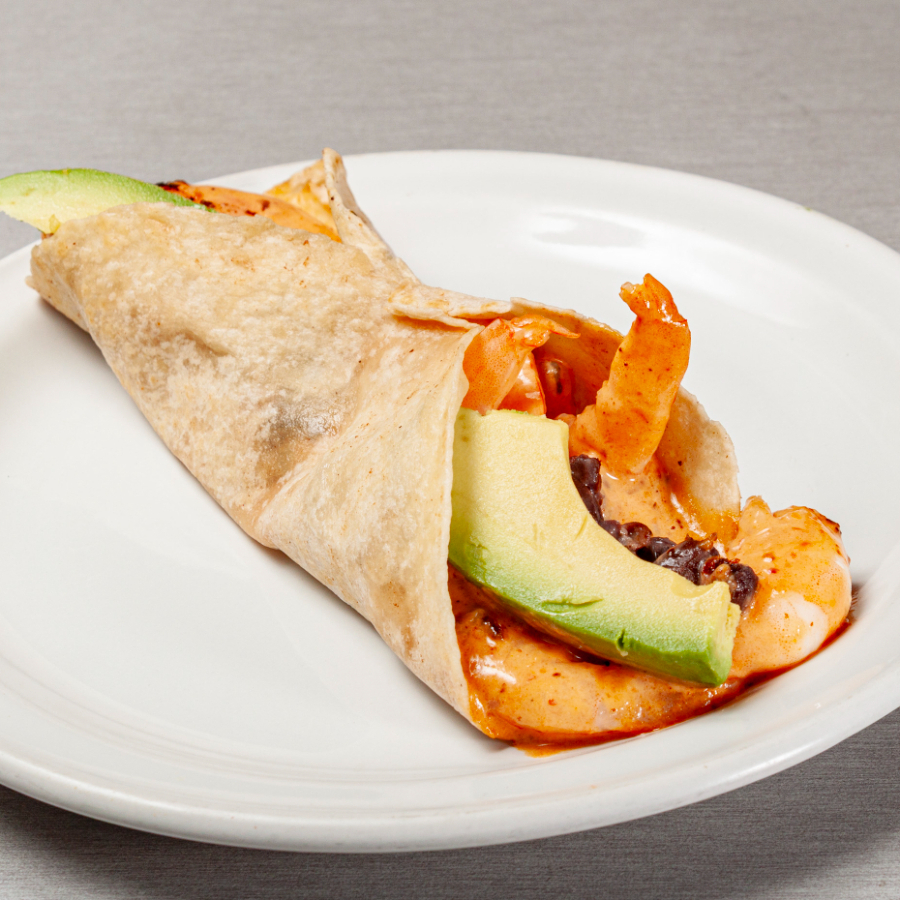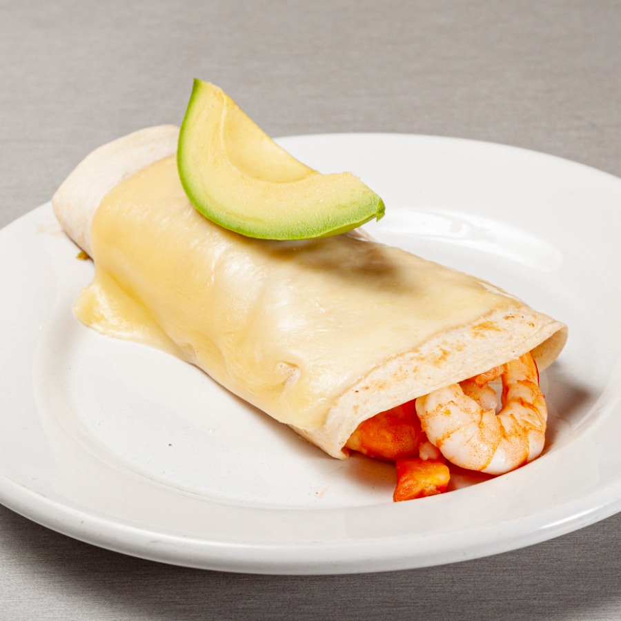 1 pz Tortilla de harina con camarón, aderezo de camarón,queso manchego,frijol y aguacate