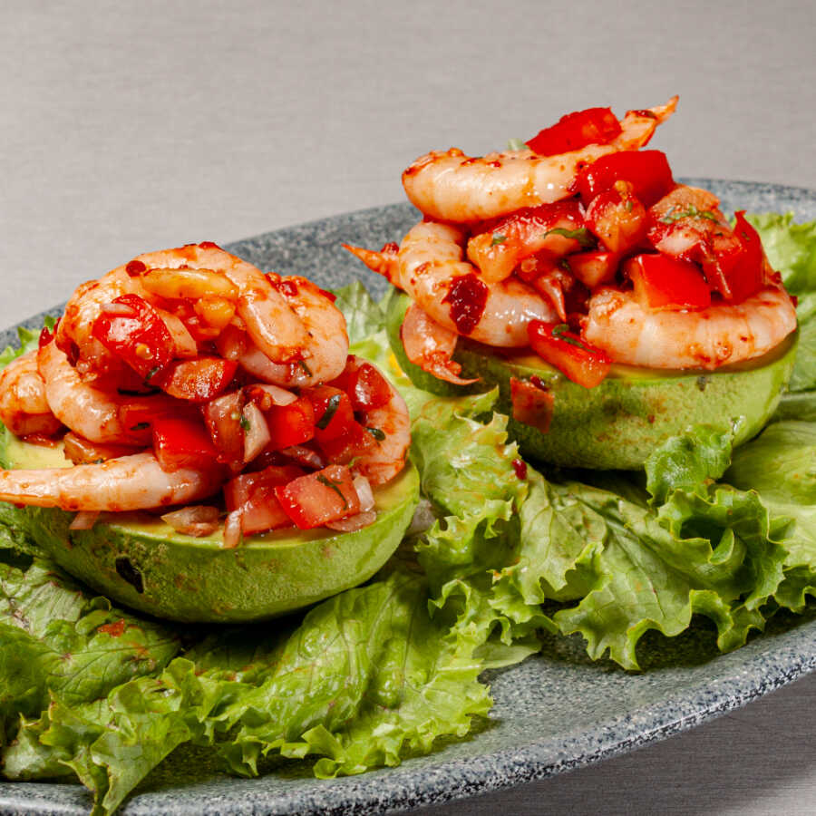 1pz Aguacate relleno de camarón,cebolla,jitomate y chipotle.