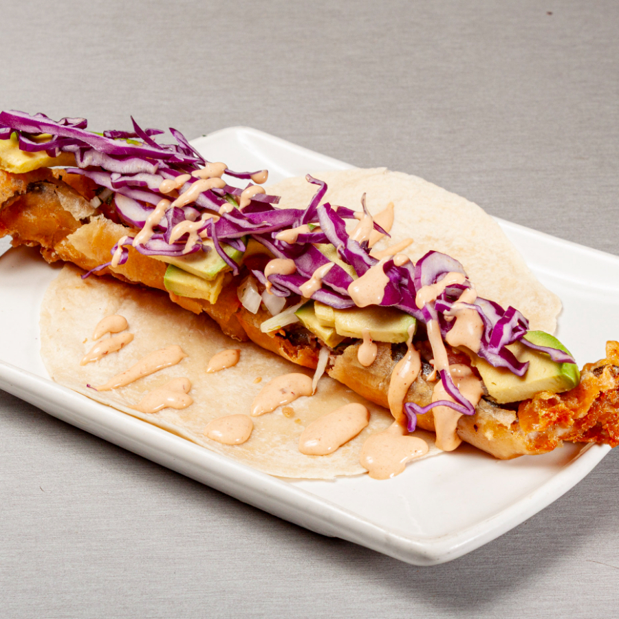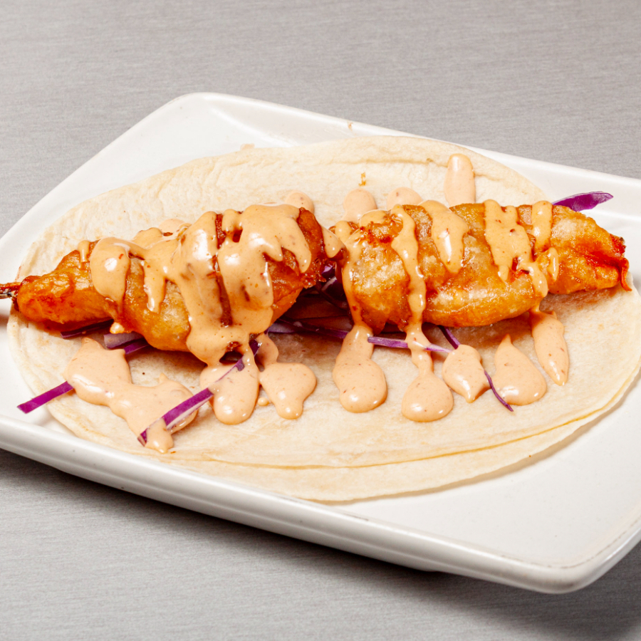 1pz Tortilla de harina con una tira de pescado rebosado,pico de gallo,col morada y aderezo de camaron