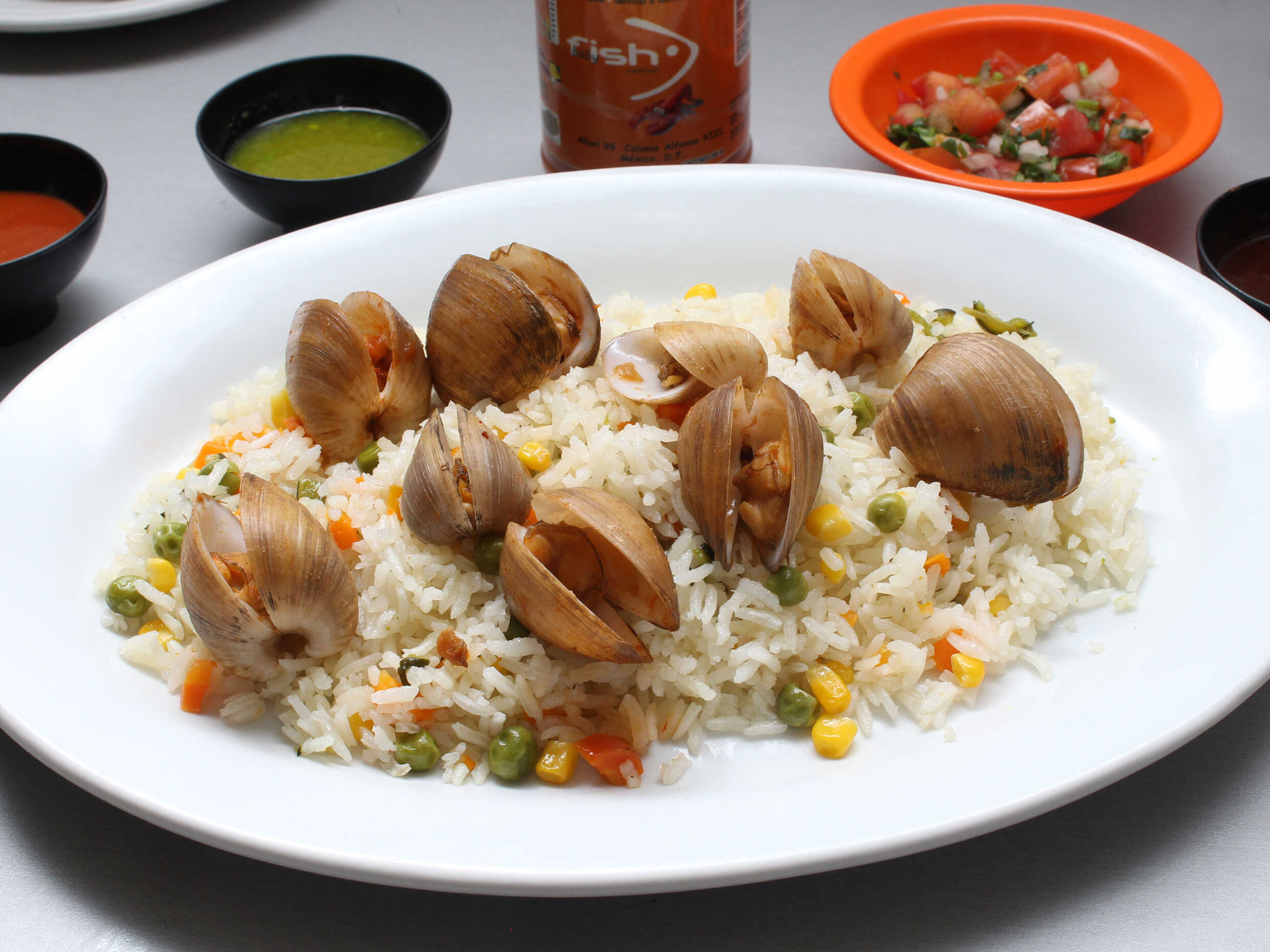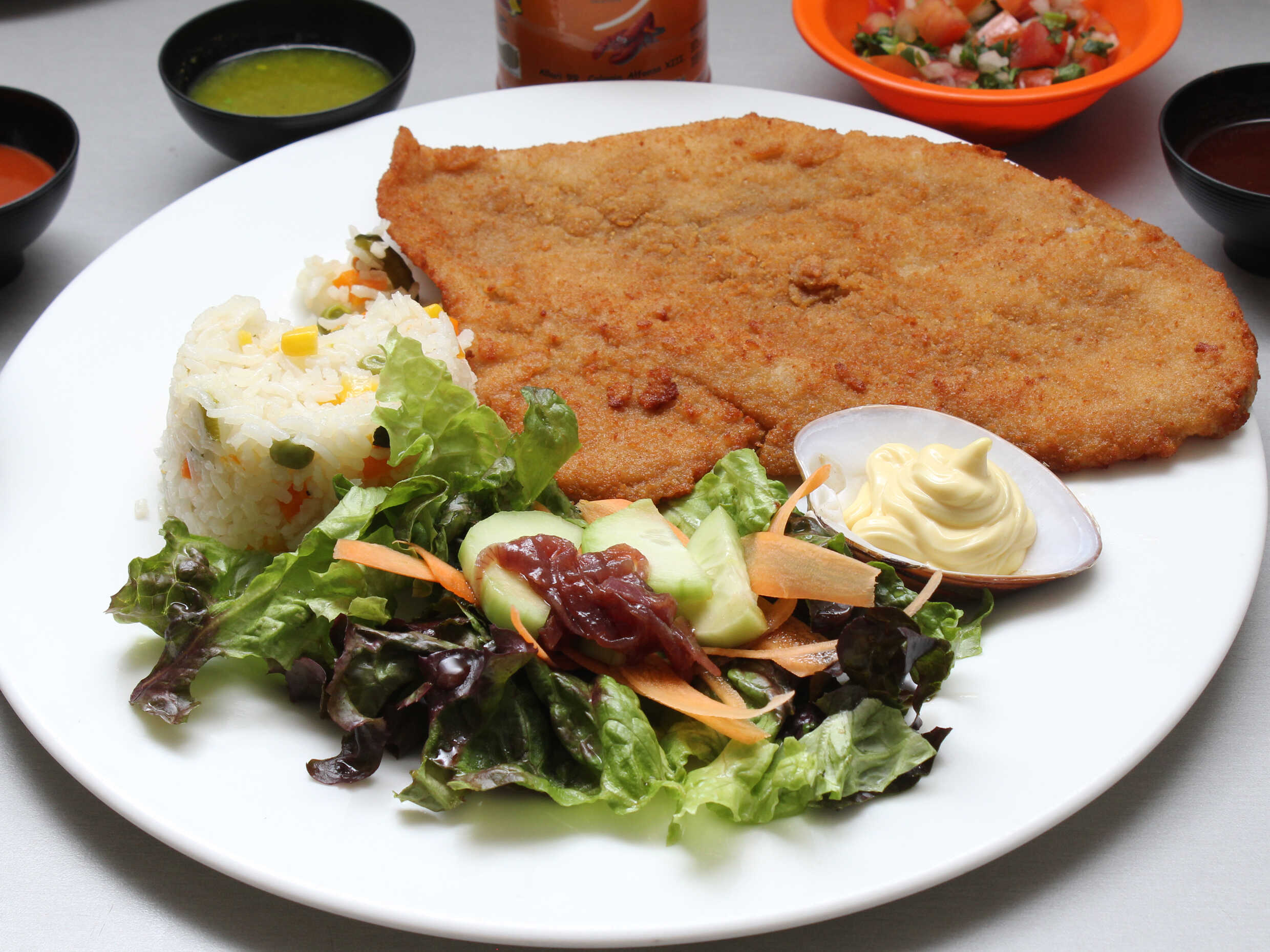 Acompañada de arroz y ensalada.