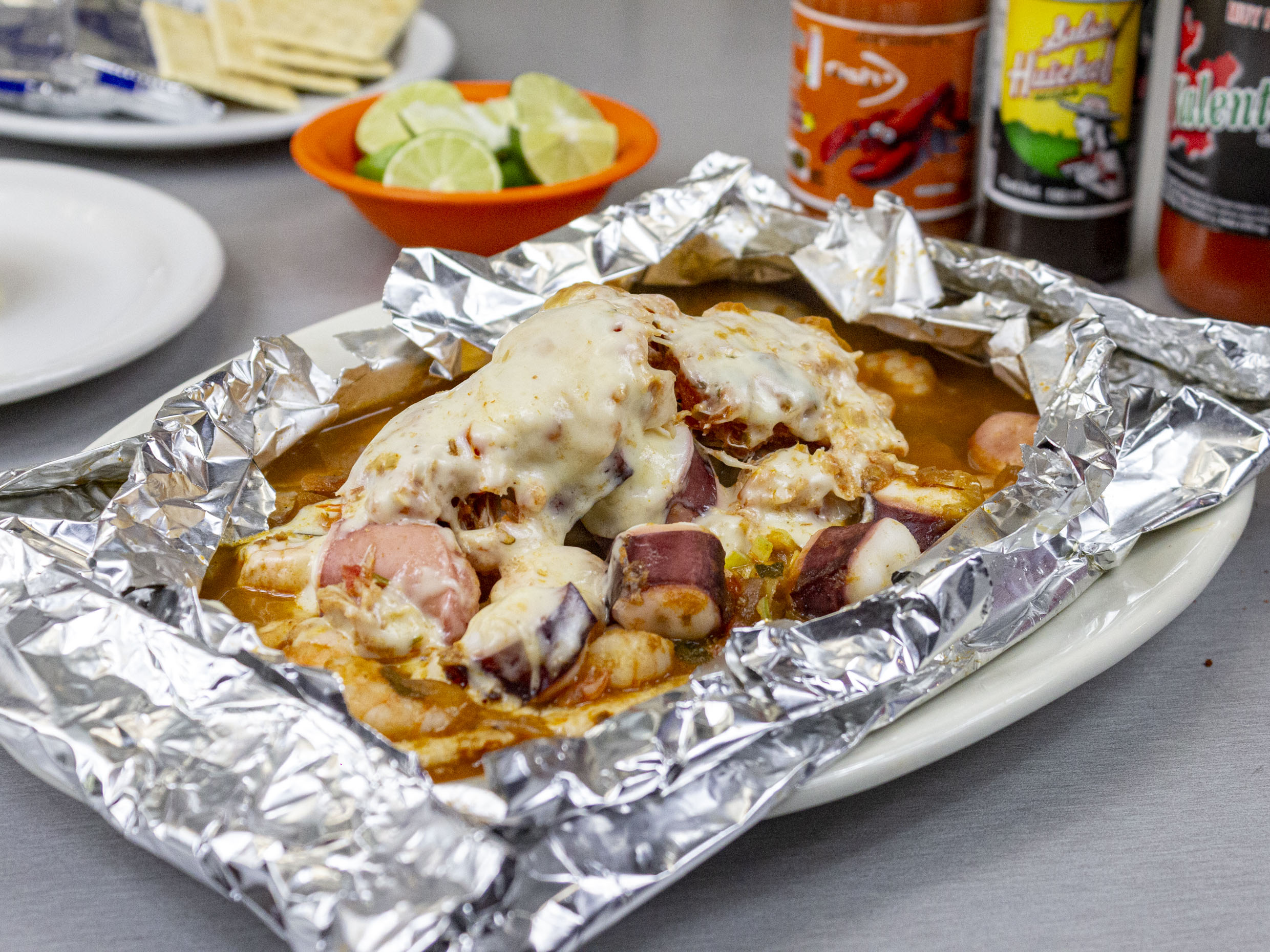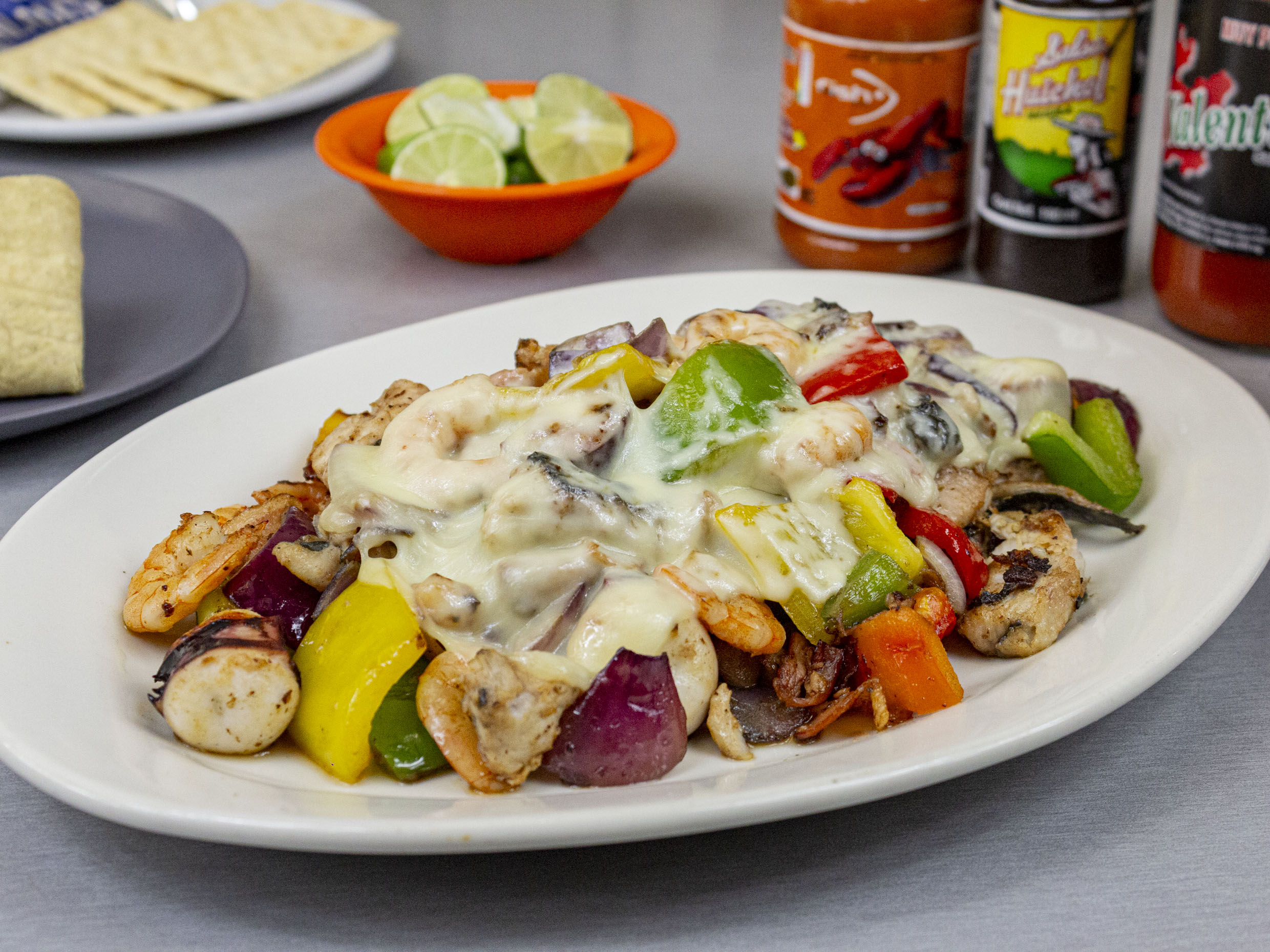 Preparado con cebolla, tocino pimiento, camarón pacotilla, pulpo, pescado y queso manchego va con tortilla de harina.