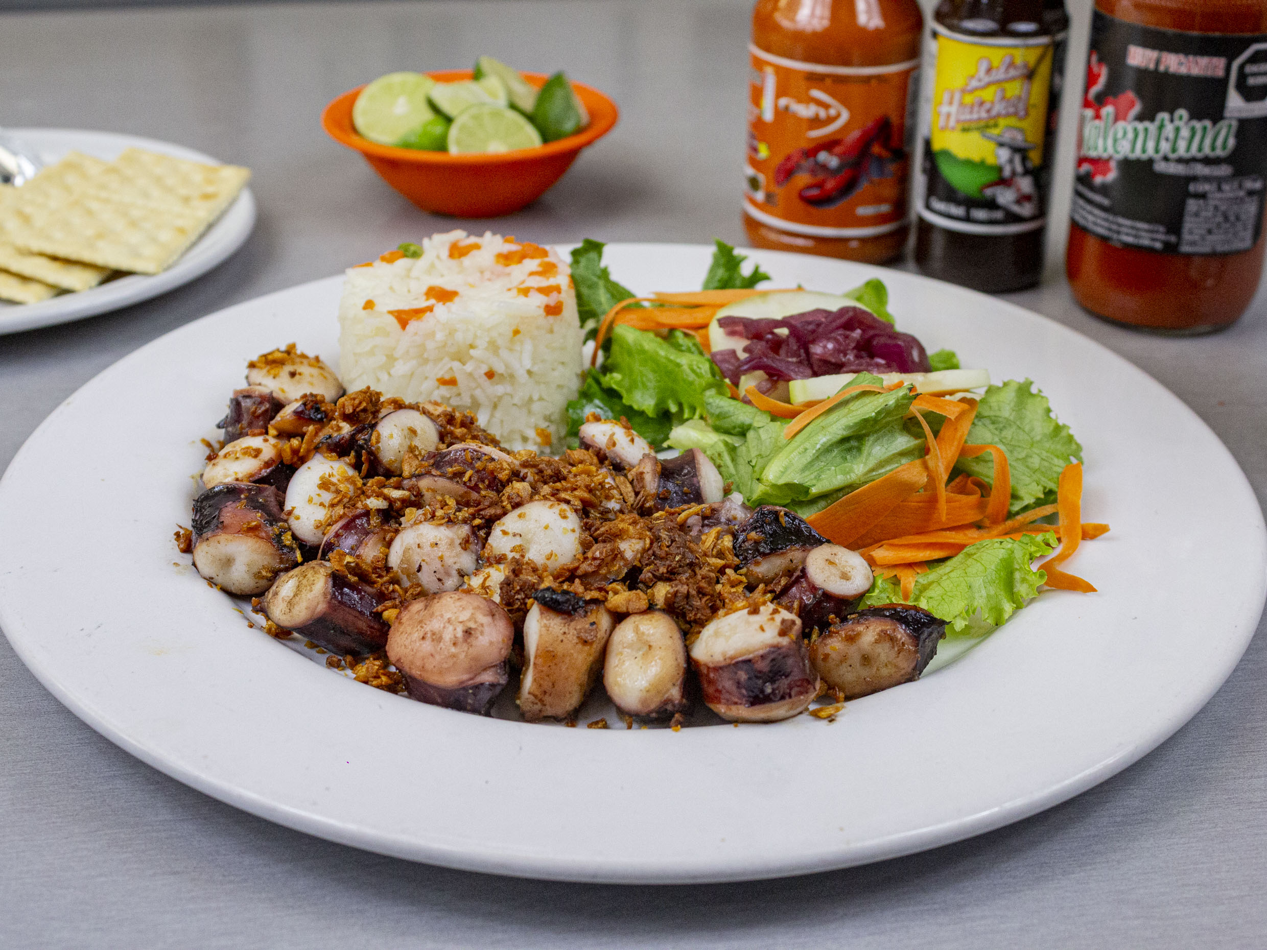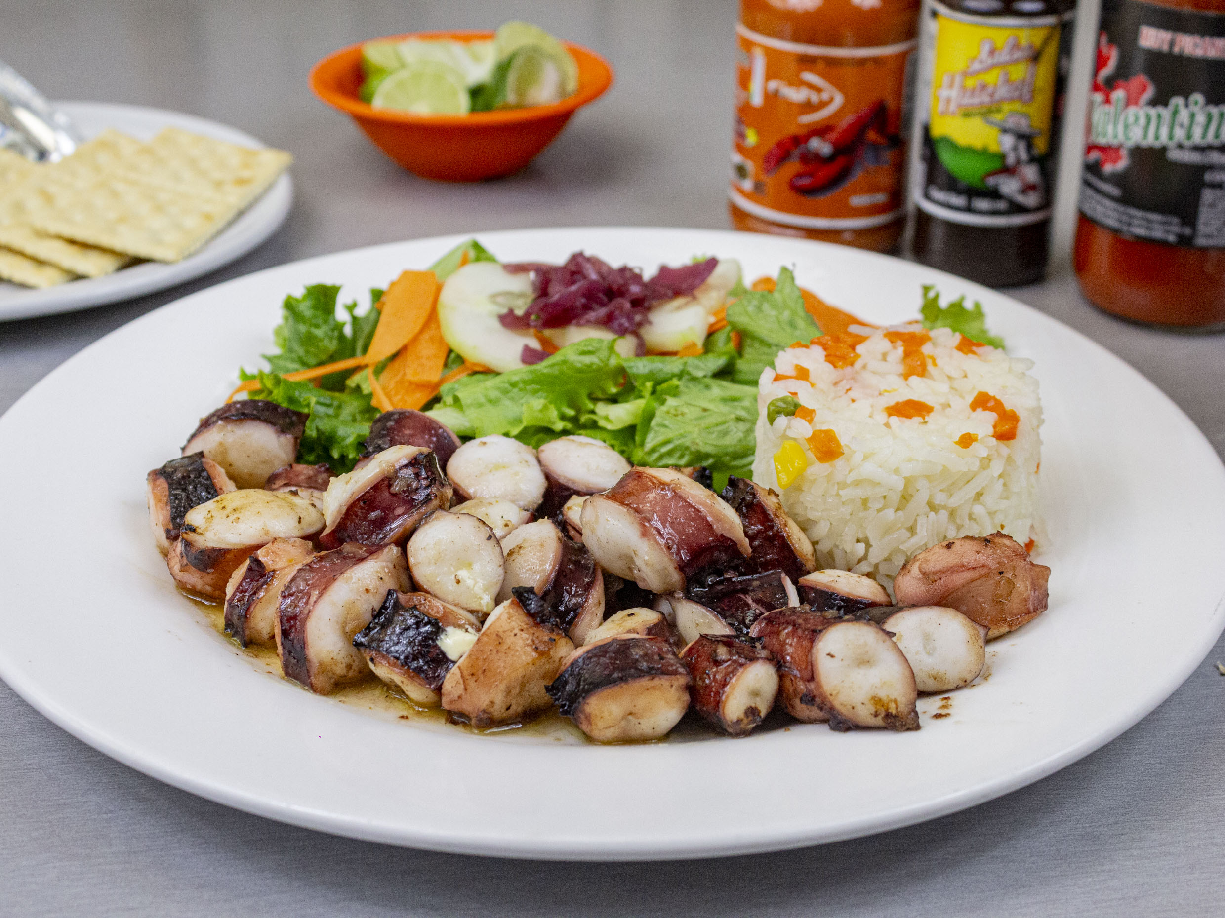 1 pz con pulpo,callo de almeja,pescado y cámaron pacotilla y un aderezo de mayonesa con habanero.