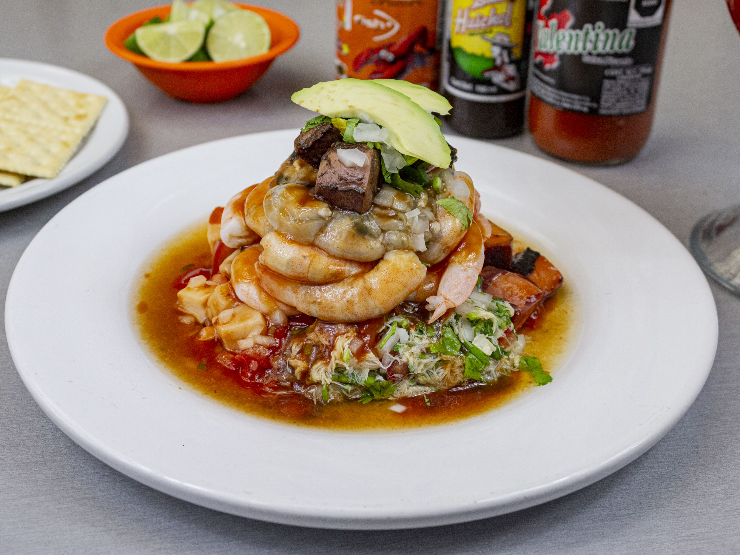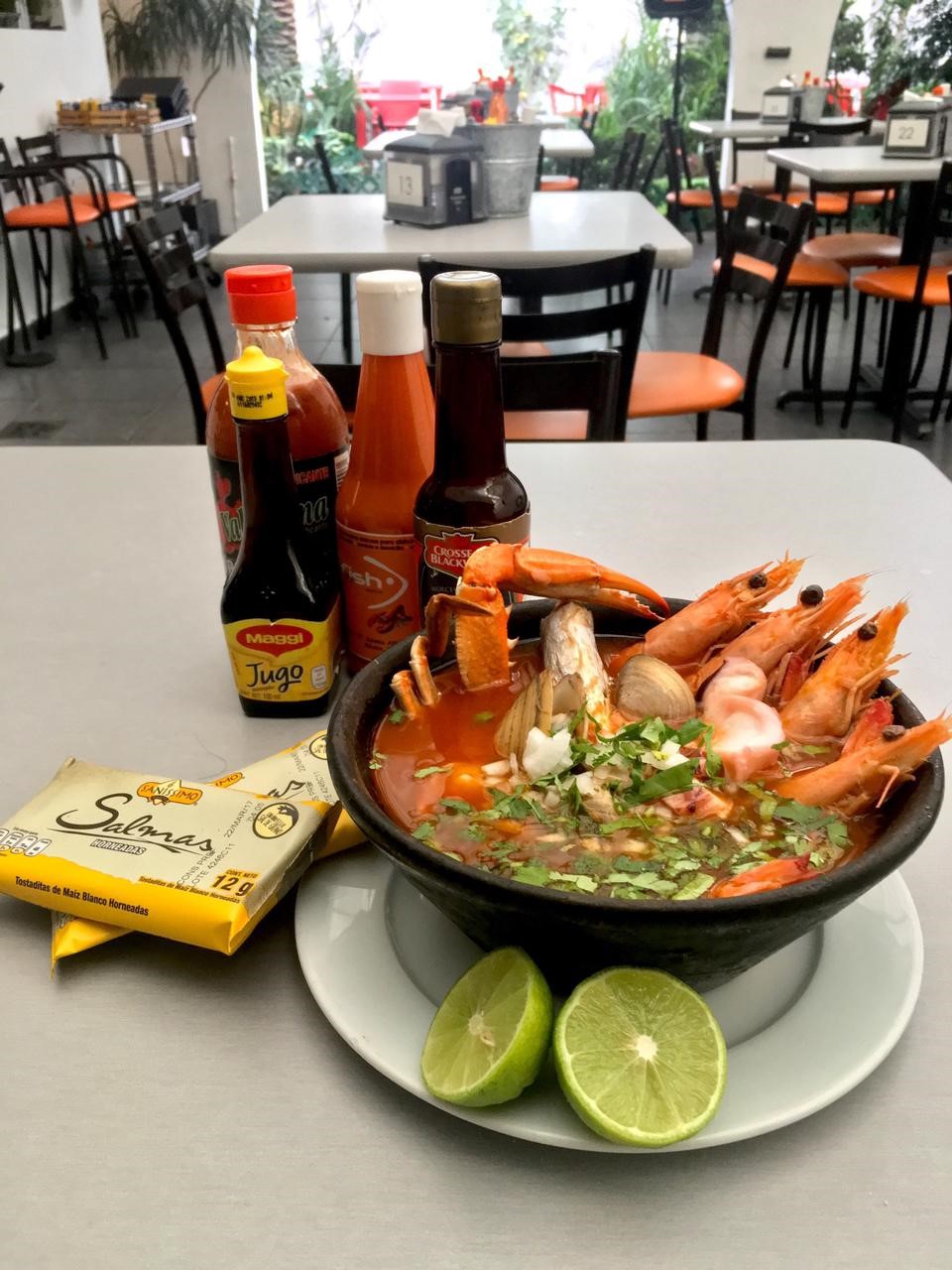 Caldo con rebanada de pescado, jaibón,ostión,pulpo,camarón para pelar,almeja,cilantro y cebolla.