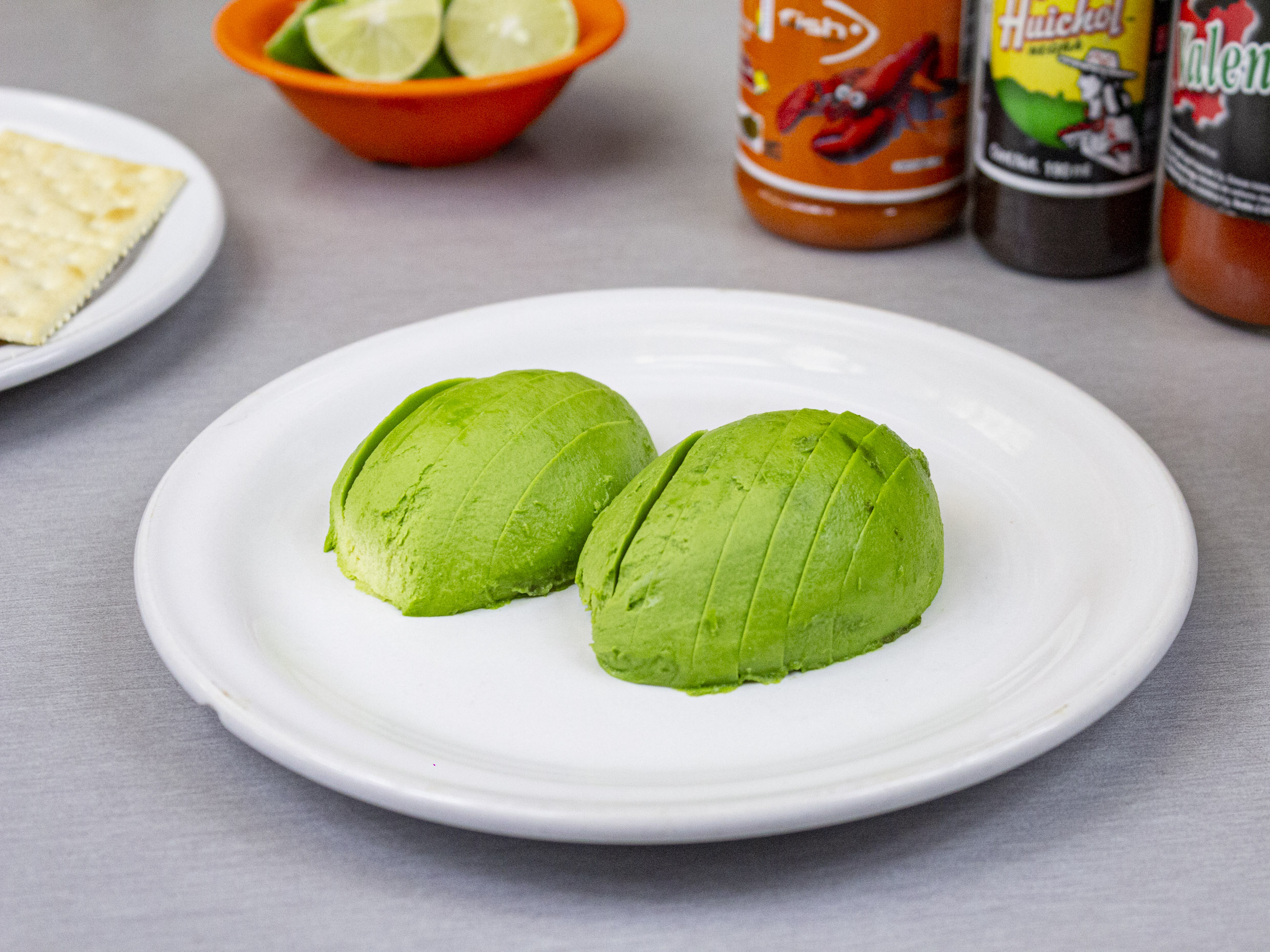 1pz,aguacate relleno de atún con mayonesa en una cama de lechuga.