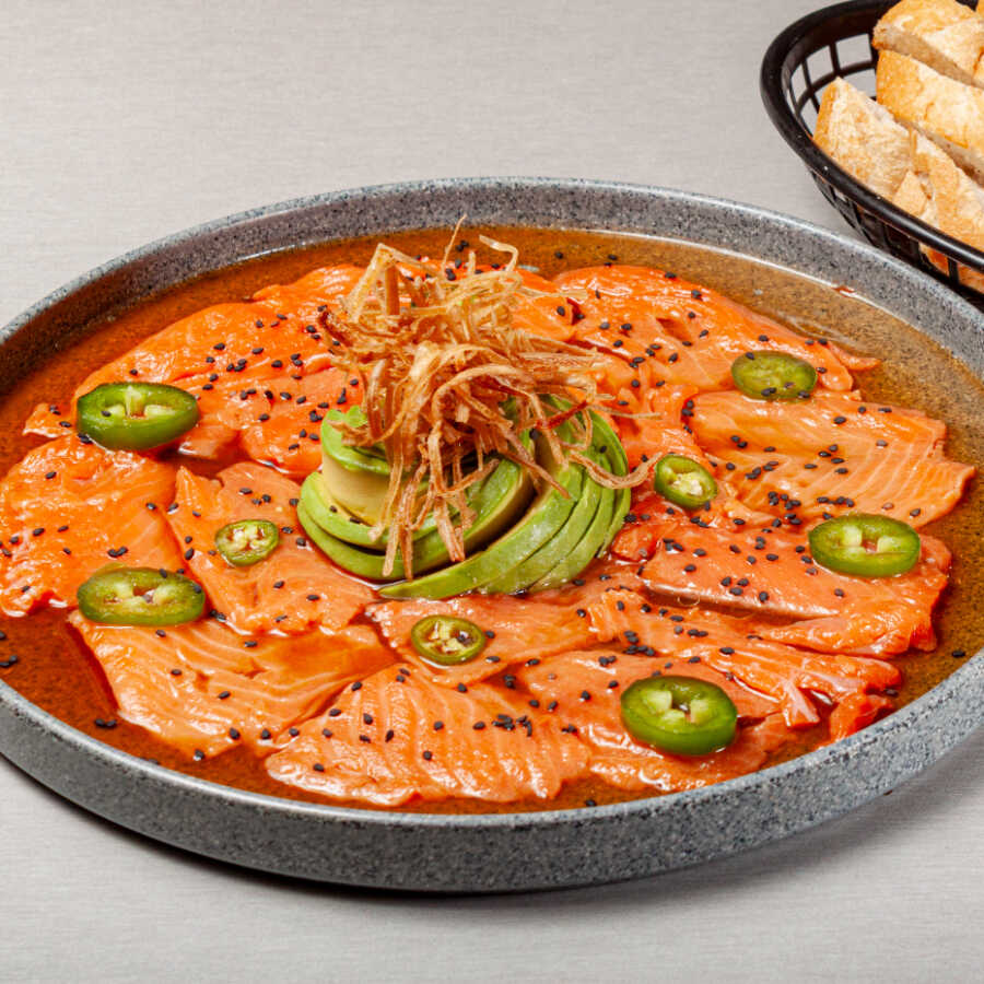 Laminas marinadas con salsa de soya,chile serrano,ajonjolí tostado y aguacate