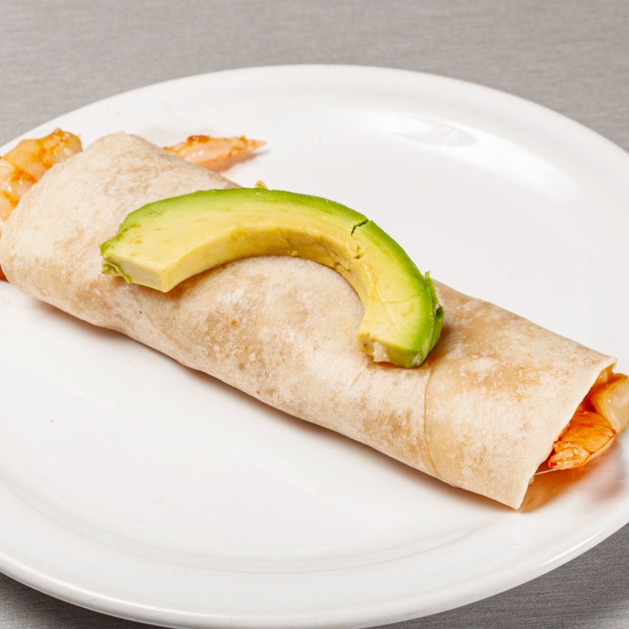 1pz 40gr Tortilla de harina rellena de camarón pacotilla,piña y queso manchego y una rebanada de aguacate.