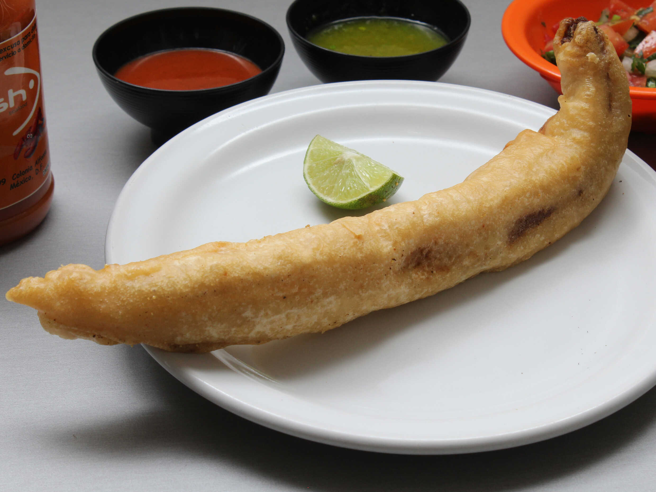 1pz 70gr Tira de pescado rebozado con pico de gallo y aguacate.